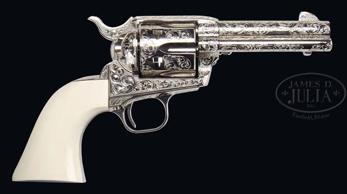 *FACTORY ENGRAVED SPECIAL ORDER COLT SINGLE ACTION ARMY REVOLVER. SN S05304A. Cal. 44-40. Nickel finish with most unusual 4″ bbl with ejector rod, full thick front sight and 2-line address with caliber marking on left side. Frame is black powder style with 3-line patent dates and mounted with 1-pc ivory grip numbered to this revolver. SN was observed in usual place on the frame, on left side of front & back straps under the grip. Bottom of bbl, under ejector rod housing, is stamped with last three digits of SN which are also on inside radius of ejector rod housing. Cylinder also has the last three digits of the serial number around the busing hole and the caliber is marked on rear face of the cylinder. Frame & bbl have full coverage, very well-executed foliate arabesque patterns with punch dot background. Cylinder has matching patterns on the lands between the flutes and on the rear edge. Ejector rod housing, back strap & butt strap are engraved to match. Sides of hammer are also engraved to match. PROVENANCE: Dr. Joseph A. Murphy Collection. CONDITION: New & unfired with no drag line. Grip is pristine. 4-36503 JR146 (4,500-6,500)