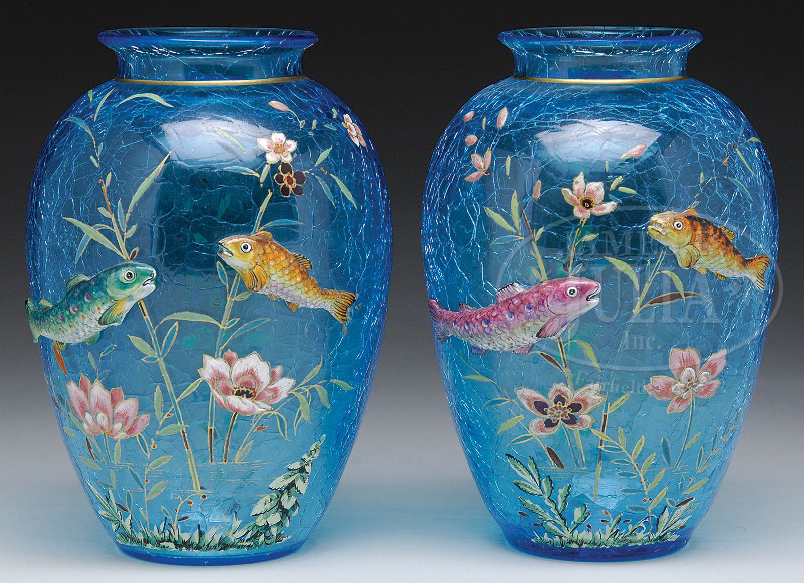 PAIR MOSER AQUATIC LIFE VASES. Blue bulbous crackle glass vases have applied fish with underwater flora. The fish are realistically enameled in greens, oranges and mauve with the flowers enameled in pinks, white and burgundy. Vases are finished with gold highlighting. SIZE: 8″ t. PROVENANCE: From a private west Texas collection. CONDITION: Very good with repair to one fish head and minor wear to gold. 5-65947 (1,500-2,000)