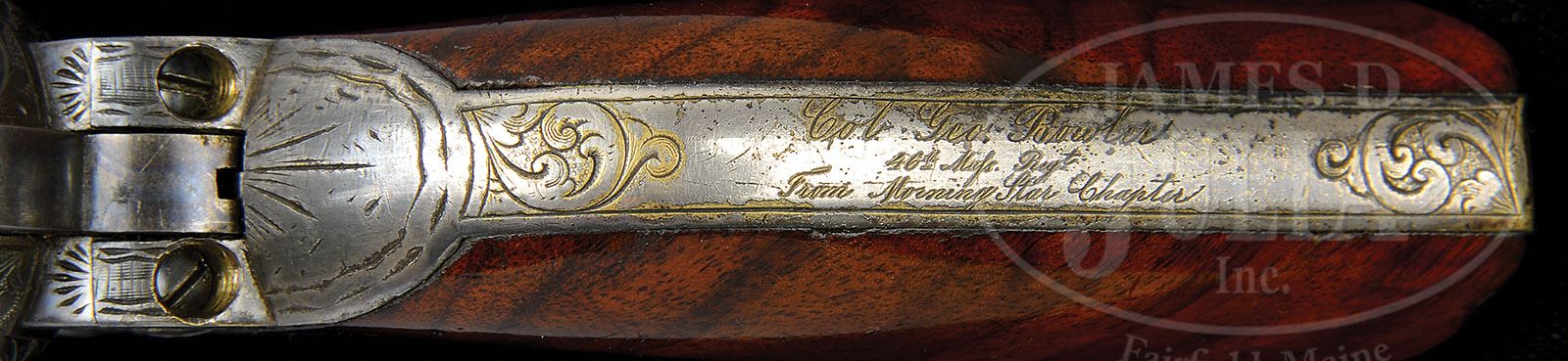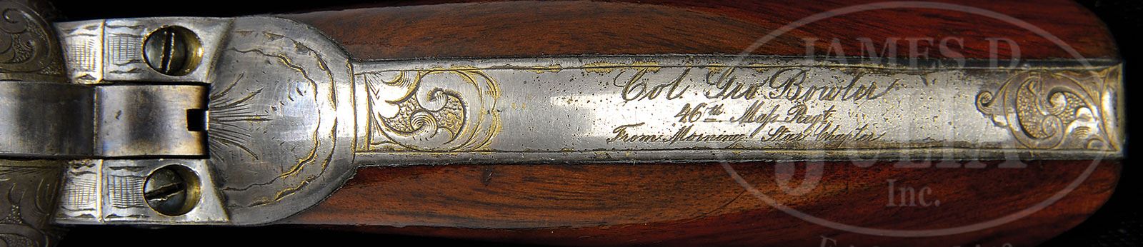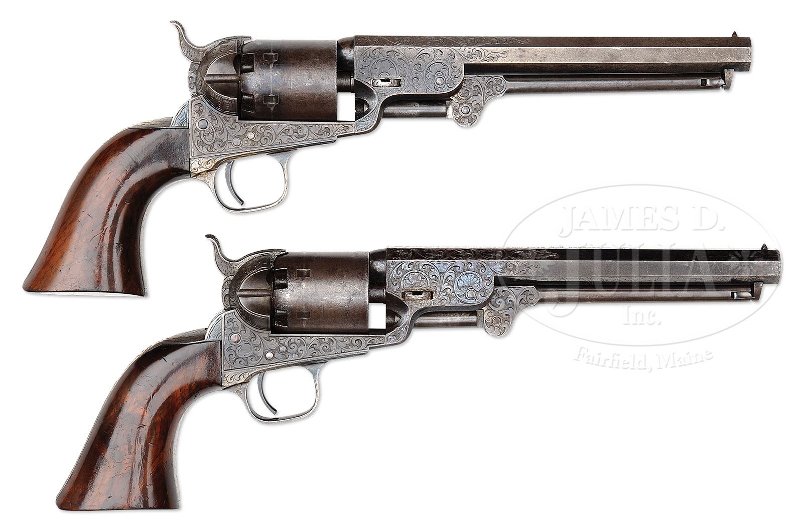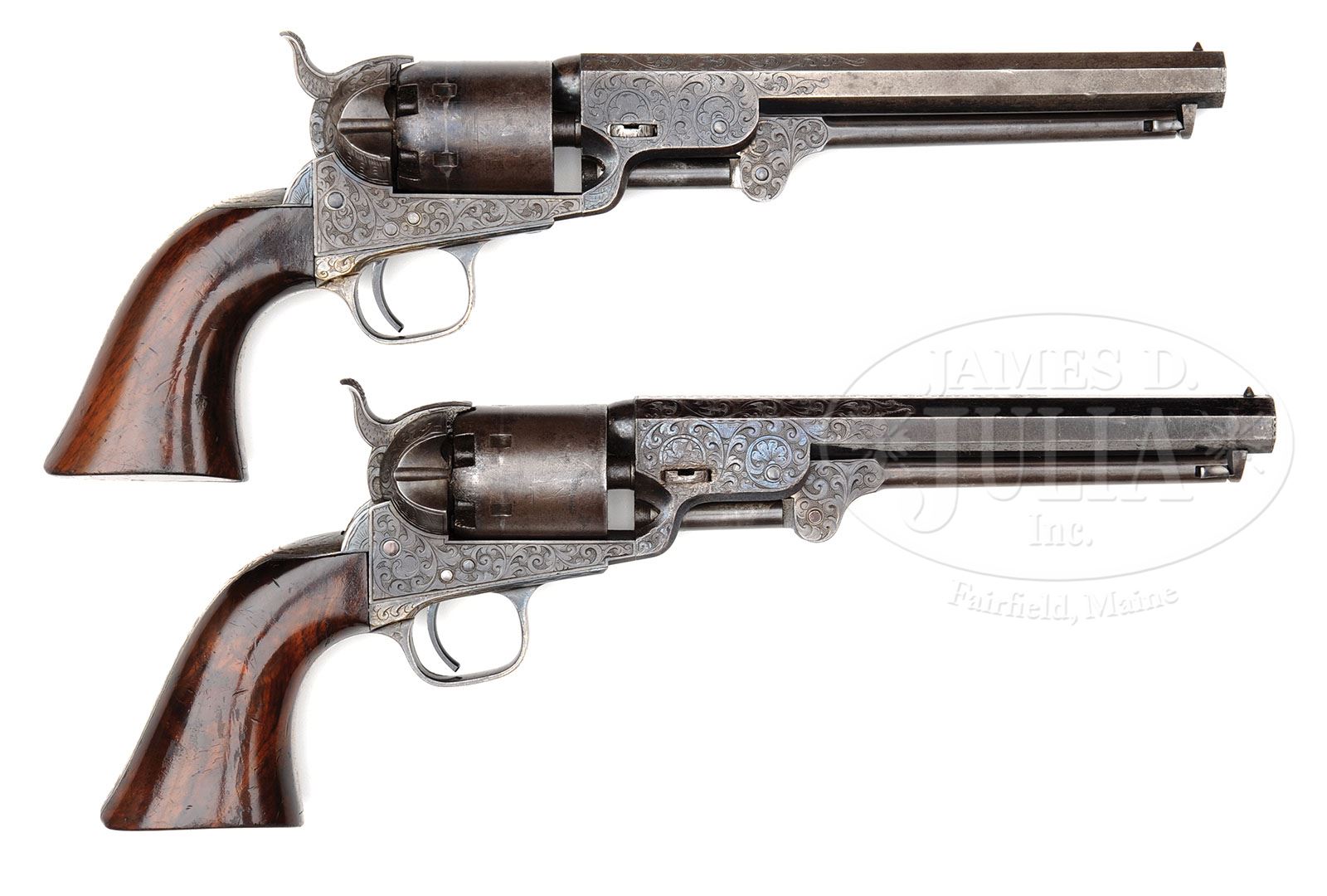 RARE PAIR OF CASED ENGRAVED PRESENTATION COLT MODEL 1851 NAVY PERCUSSION REVOLVERS. SN 128369 & 128372. Cal. 36. Both revolvers are identical configuration with 7-1/2″ oct bbls, pin front sights and New-York U.S. America addresses. Both are marked “COLTS PATENT” on the left side of the frames. They have usual 6 shot cylinders with Ormsby Naval battle scene roll markings. The fourth model large guard silver plated trigger guards and backstraps contain very nicely figured deluxe varnished 1-pc walnut grips, matching numbered to their respective revolvers. Revolvers are blue and case colored and are nearly identically engraved by Gustave Young with full coverage foliate arabesque patterns on the frames which extend over the bbl lugs, top side flats of the bbls and rammer pivots. Hammers are deluxe engraved with wolf heads on each side of hammer noses and fish scale patterns on the spurs and top edges. Matching engraving extends down the backstraps over the buttstraps and trigger guards. Several of the scrolls terminate in flower blossoms and one scroll on the left side of the bbl lug of #128372 terminates in a very detailed eagle’s head. Backstraps are engraved in period script “COL. GEO. BOWLER / 46TH MASS REGT / FROM MORNING STAR CHAPTER”. Accompanied by what is probably their orig red velvet lined mahogany 2 gun casing which is compartmented in the bottom for the 2 revolvers, a rare double sided eagle and trophy of flags & arms flask with angle spout, a blued 2 cavity Colt’s patent mold with sprue cutter marked on the right side 36B, an “L” shaped nipple wrench, a packet of sage combustible cartridges, a lacquered tin of Ely’s caps, lead bullets and balls and a functioning key. The 46th Mass was raised in Hampden County, Mass in September & October 1862 by Reverend George Bowler who was elected the units first Colonel. Colonel Bowler was commissioned October 27, 1862, mustered in October 30,1862, resigned on December 23, 1962 and was discharged January 23, 1863 for disability. The regiment left camp on November 5th for Boston and was transported to Newbern, NC arriving there November 15th where they were assigned to Col. Lee’s brigade. Initial duties were guarding the railroad station at Newport barracks. They saw their first active duty and were present at the battles of Kinston, Whitehall and Goldsboro December 14-17, and were only slightly engaged suffering little loss. By December 20, they were encamped near the confluence of the Neuse and Trent rivers, about which time Col. Bowler resigned and subsequently was mustered out. Col. Bowler was ill during the December 14-17 campaign and although he did accompany the regiment in the field, it is unknown what his participation may have been. This pair of revolvers is pictured as figure 12 on page 12 of the May 1963 issue of The Gun Report in an article by John G. Hamilton wherein he gives credit to the Jay P. Altmayer Collection. PROVENANCE: Jay P. Altmayer Collection; C.G. Johnson Collection; Johnny Bassett Collection. Michael Leff Estate Collection. CONDITION: 1) SN 128369. Very fine, all matching including wedge and grip. Bbl retains 90-92% glossy orig blue with some sharp edge loses and minor flaking. Rammer and handle retain dark case colors as does the frame and hammer. Trigger guard and backstrap retain about 85% orig silver. Cylinder is a light brown patina with scattered light pitting and shows 40-50% Ormsby naval battle scene. Grip is sound showing light edge wear, a few nicks and scratches and retains most of its orig varnish. Wedge spring is broken. Mechanics are fine. Strong bright bore with scattered pitting. 2) SN 128372. Very fine, all matching. Bbl retains 30-40% thin orig blue with the balance flaked to a light patina. Remainder of revolver is nearly identical condition as above. Grip retains about 98% crisp orig varnish. Mechanics are fine. Bright shiny bore with a couple of spots of pitting. Case has a repaired crack across the lid and another in the bottom and retains most of a restored finish. Interior is moderately faded with light soil inside the lid and heavier soil in the bottom. Flask is extremely fine with a couple of small dents and retains most of its orig lacquered finish. Mold has a few small nicks on the sides and bottom with good sharp cavities and strong blue. Other accessories are fine. 4-49629 (58,000-90,000)