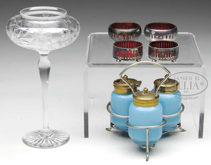 LOT OF ART GLASS. Nice lot includes a pedestal cut glass vase with flower decoration and star cut foot, four open salts with cranberry inserts and silver plated frames; two frames marked “Pairpoint Mfg. Co. New Bedford Mass” and a blue bristol glass condiment set with salt and pepper shakers with mustard pot in a nickel plated frame. SIZE: Vase is 7″ t. CONDITION: Very good to excellent with some wear to silver plating on salts. One shaker top needs to be reattached and mustard pot is missing spoon. 5-63246, 5-63289, 5-63292 (50-100)
