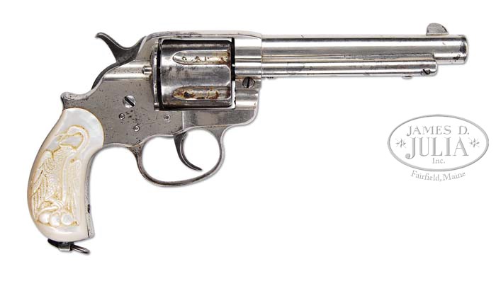 FINE COLT MODEL 1878 FRONTIER SIX SHOOTER DA REVOLVER. SN 31506. Cal. 44 WCF (44-40). Nickel finish with 5-1/2″ bbl, orig front sight with 1-line block letter address and “COLT FRONTIER SIX SHOOTER” roll marked on left side. There is a tiny “44” on bottom of bbl under base pin. Mounted with 2-pc pearl grips deep relief carved on right side with a wonderfully detailed Mexican eagle. Bottom of butt has a factory lanyard swivel. Left side of grip frame, under grip, is stamped with the assembly number “6” which number was also observed on back of loading gate. Serial number is in its usual place on toe of butt with last three digits of SN on rear face of cylinder. These revolvers were very popular on the U.S. frontier, in the Northwest Territories and Alaska for their resemblance to the venerable Single Action Army with the same calibers plus the addition of double action. PROVENANCE: John Irwin Estate Collection. CONDITION: Very good, all matching including cylinder, except grips which are unnumbered. Overall retains about 70% orig nickel finish with holster wear on left side of bbl and losses around muzzle and on ejector rod housing. Back strap and front straps are bright polished metal with fine pitting on front strap. Cylinder also shows some nickel losses with scattered fine pitting. Grips are outstanding with some minor age lines and great fire with sharp carving. Hammer spring has been lightened, otherwise mechanics are fine, bright shiny bore with scattered very fine pitting. 4-36758 JR130 (2,500-4,000)
