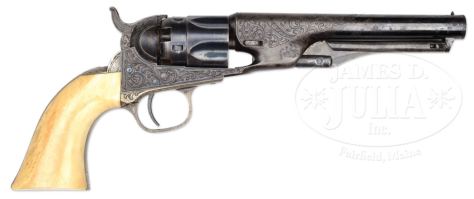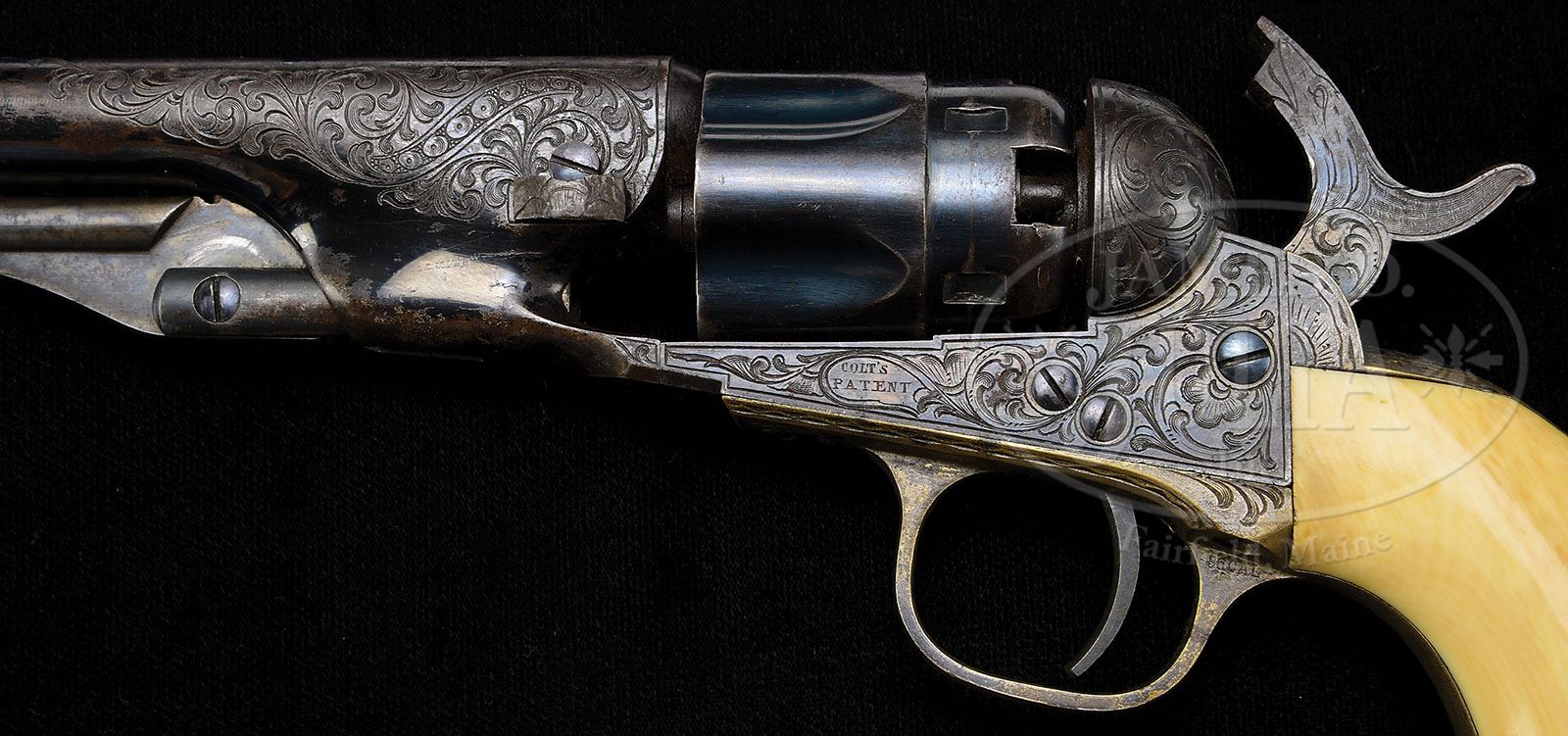 VERY RARE CASED ENGRAVED COLT MODEL 1862 POLICE PERCUSSION REVOLVER. SN 41291. Cal. .36. Blue and color case hardened with 5-1/2″ rnd bbl. Brass pin front sight & 1-line New-York U.S. America address. Left side of frame is engraved “COLT’S PATENT” in a pillow shape. Silver-plated brass trigger guard and backstrap contain a 1-pc orig ivory grip, matching numbered to revolver. Revolver is beautifully engraved in late vine style, probably by Gustave Young, with some scrolls terminating in flower blossoms. Engraving extends over sides of bbl and around address, on backstrap, buttstrap and trigger guard. Both sides of hammer nose are engraved in wolf’s head patterns. Cylinder is 1/2 fluted with 5 chambers. Accompanied by orig, spectacular, brass-bound green baize-lined rosewood casing with brass plaque in top engraved with initials “C.A.”. Interior is French-fitted for revolver, fine dbl-sided eagle & shield flask, presentation quality highly polished blued steel 2-cavity Colt’s Patent mold with sprue cutter marked on right side “36P”, L-shaped nipple wrench and lacquered tin of Goldmark’s caps. Covered compartment in right rear contains lead, bullet & balls. According to Flayderman’s Guide to Antique American Firearms, there were only about 28,000 of these scarce revolvers produced in the period 1861 through 1873 when they were supplanted by the advent of cartridge revolvers. Engraved & cased examples of this model are extremely rare with only a few known and surviving examples are rarely found with high orig finish. PROVENANCE: Michael Leff Estate Collection. CONDITION: Very fine, all matching inc. wedge, cylinder & grip. Bbl retains about 50% glossy orig blue with balance having flaked, not worn, to a dark patina. Rammer handle retains strong case colors, bright on pivot. Frame & hammer retain strong, bright case colors. Cylinder retains about 70% orig blue, strong & bright in flutes with strong blue in chambers. Trigger guard & backstrap retain thin orig silver-plating. Grip is crisp with sharp edges and wonderful dark ivory patina. Mechanics are crisp, bright shiny bore. Screws are crisp and retain most orig blue. Case is sound with usual storage & handling nicks & scratches and retains most of its orig varnish. Interior is moderately faded with light soil inside lid & moderate to heavy soil in bottom. Accessories are all fine. A wonderful & rare set. 4-49641 JR7 (25,000-40,000)
