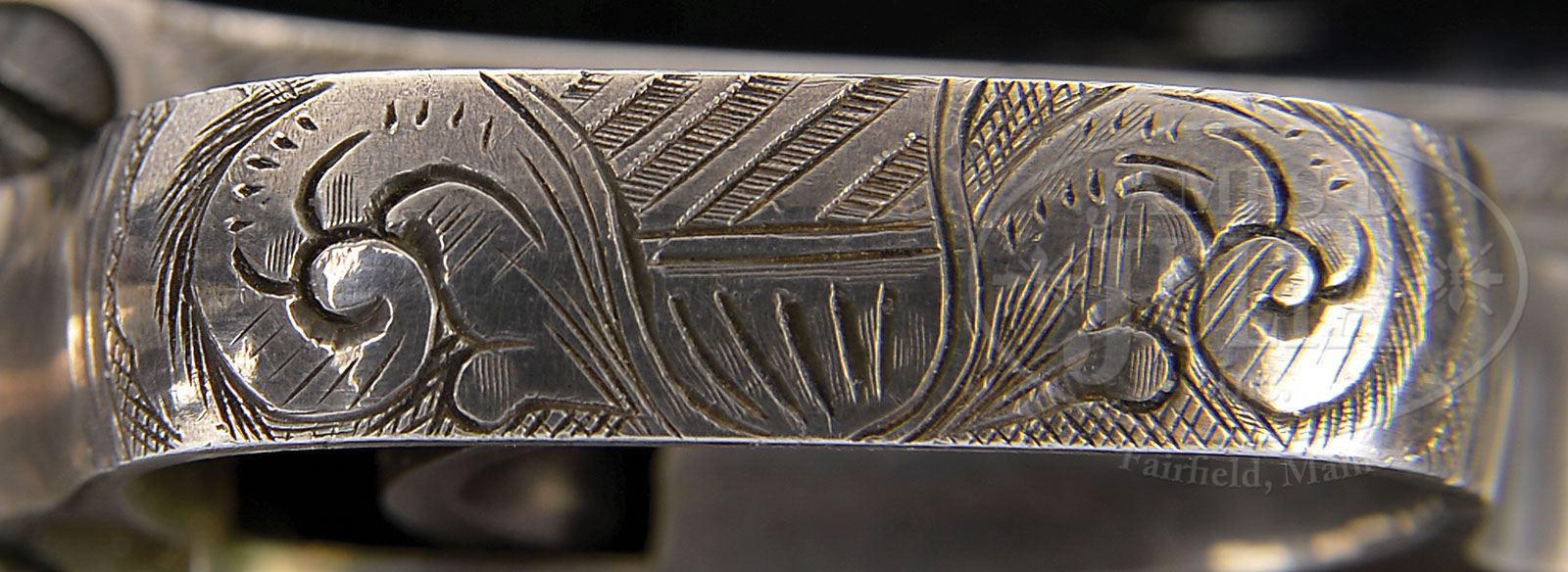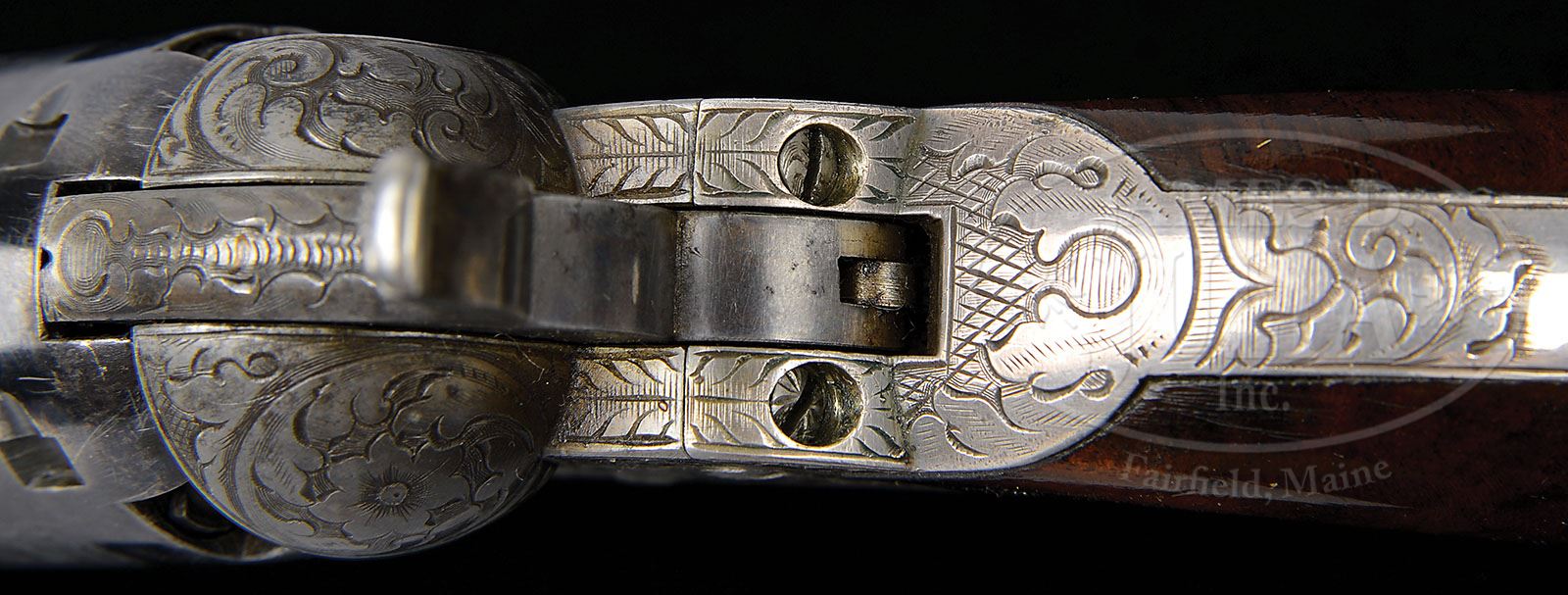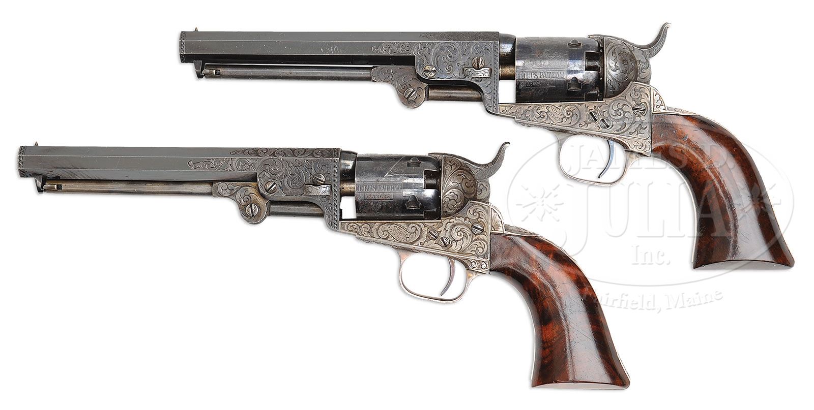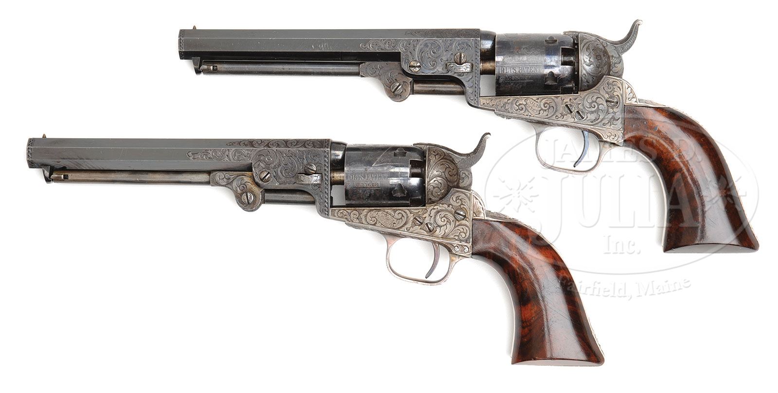 RARE CASED PAIR OF ENGRAVED COLT MODEL 1849 POCKET PERCUSSION REVOLVERS. SN 33612 & 33633. Cal. 31. Both revolvers are virtually identical, blue and color case hardened with 6″ oct bbls, engraved “Saml Colt” addresses, pin front sights with #33612 having a right hand address and #33633 having a left hand address. Both revolvers have silver plated trigger guards and backstraps containing highly figured, burl walnut 1-pc grips matching numbered to their respective revolvers. Both have 5 shot cylinders with stagecoach hold up scene roll markings and all 5 safety pins intact on both cylinders. They are engraved virtually identical with “COLTS PATENT” in a ribbon on the frames with the frames having about full coverage large scroll patterns with very fine shaded background. One of the scrolls on the recoil shield of #33633 terminates in a very detailed flower blossom. Matching engraving patterns extend over the bbl lugs and rammer pivots, on the backstraps, buttstraps and trigger guards. Top of the backstraps are engraved differently with #33612 having a fan pattern and #33633 leaf and geometric patterns. Trigger bows are engraved with small American shields and edges of the trigger guards are in feather patterns. All screw heads are nicely engraved. Hammers are deluxe engraved with a wolf’s head on each side of the hammer noses, fish scale patterns on the sides of the spurs and top edges. Accompanied by a beautiful brass bound rosewood casing that has a gold washed plaque in the lid, hand scratched “W. THOMSON / Canada 1851” Interior is dark blue velvet lined and compartmented in the bottom for both revolvers, a double sided eagle and shield pocket size flask, a brass 2 cavity “COLTS PATENT” mold without sprue cutter, an “L” shaped nipple wrench, a lacquered tin for Eley’s caps, along with lead bullets and balls and a functioning key. This set is illustrated on page 73 of the book The Wm M. Locke Collection, Sellers. It appears that the mold and cap tin have been changed from this photograph, though they are from the period of this set. Pistols also appear on page 79 as item 46 plate XXVIII in the book Samuel Colt Presents and page 39 of Colt Engraving both by Wilson. PROVENANCE: William Locke Collection; Arnold Marcus Chernoff Collection. Michael Leff Estate Collection. CONDITION: Revolvers are nearly identical in condition, both all matching except the wedge on #33633 is unnumbered. Both retain about 98% glossy orig blue on the bbls and dark case colors on the rammers and handles. Frames retain most of their orig muted case colors as is typical of the Colts of this era. Cylinders retain virtually all of their bright orig blue and about 99% stagecoach hold-up scene roll markings. Cylinder on #33612 has a large “Z” shaped scratch. Trigger guards and backstraps retain virtually all of their orig silver plating with some minor edge wear. Grips are sound with good edges and light nicks & scratches and retain most of their strong orig varnish. Mechanics are crisp, brilliant shiny bores with a few small scattered spots of pitting. Case has a crack across the lid, otherwise is sound with handling and storage nicks and scratches and retains most of its orig varnish. Interior is lightly soiled inside the lid and bottom with light to moderate soil in the bottom. Partitions are all solid. Flask is as new. Mold is of the correct period with casting flaws in the brass, otherwise is extremely fine. Other accessories are equally fine. A truly spectacular set worthy of the most advanced collection. 4-49626 (70,000-80,000)