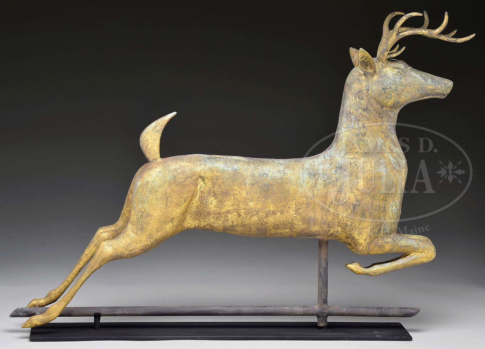 RARE LEAPING STAG FULL BODY COPPER WEATHERVANE. Last quarter 19th century, attributed to E.G. Washburne & Co. The stag with zinc head and antlers and with mixed verdigris and gilt surfaces. Now mounted on a museum stand. SIZE: 20″ h x 28-1/2″ l. CONDITION: Seams remain tight. Surfaces appear unaltered. Right proper rear haunch with old dent before last application of gilding. Otherwise very good. 9-29679 (10,000-15,000)