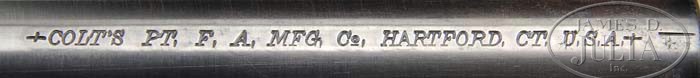 EARLY AINSWORTH COLT CAVALRY SINGLE ACTION ARMY REVOLVER. SN 1334. Cal. 45 Colt. Blue & color case hardened with 7-1/2″ bbl, slightly altered front sight and 1-line script letter address. Bottom of bbl, has the SN slightly off center under base pin. Left side of frame has tiny 2-line patent dates and a small “U.S.”. Left shoulder of trigger guard is marked “45 CAL” and is dbl struck. Grip is a modern replacement with a spurious “OWA” (Orville W. Ainsworth) cartouche. Accompanied by a Colt factory letter identifying this revolver in caliber 45 Colt, blue finish with bbl length & type of stocks not listed and shipped to J.P. Moores Sons on Jan. 19, 1876 in a shipment of 50 same type revolvers. This revolver is listed in the records of the U.S. Army and shows that it was issued to Pvt. Benjamin F. Morris of the 1st U.S. Volunteer Cavalry, Rough Riders, during the Spanish American War. It also shows that he was issued Krag carbine #77198. Mr. Morris was born in 1876 in Columbia, TN and moved to Raton, New Mexico, and on June 29, 1898 had traveled by train to Santa Fe to enlist in the cavalry which he apparently accomplished, and was assigned to I Troop 1st Volunteer Cavalry on July 8, 1898. He was mustered out at Camp Wikoff, NY on Sept. 15, 1898. He re-enlisted in 1899 in the infantry, Company F and was discharged on July 5, 1903. He apparently returned to New Mexico and lived in Espanola. This revolver was also the subject of an article in U.S. Martial Arms Collector and Springfield Research Newsletter, June 2010, which recounts much of the above information. The conflict in the records between Colt and the U.S. military requires additional investigation. However the presence of the caliber marking on the left shoulder of the trigger guard certainly indicates that this revolver was probably a reject or buy-back and resold on the civilian market, apparently in 1876 which would have precluded it being issued in 1898. CONDITION: Very good to fine. Overall retains about all of an extremely fine, professionally restored finish with strong orig style blue and case colors. The bbl finish is thinned on both sides at muzzle. Frame & hammer retain most of their moderately faded case colors, stronger & brighter in sheltered areas. Trigger guard & back strap retain strong blue, slightly dulled on back strap. Cylinder retains most of its fine blue with only sharp edge wear, may have been fired but if so very little. Bbl address, frame markings & all numbers appear to have been re-rolled and re-stamped. Front strap, under grip, has a welded up grip locator hole where apparently someone had mounted a set of 2-pc grips. Left side of front strap is lightly pitted. Grip is crisp retaining most of its oil finish. Timing needs adjustment, otherwise mechanics are fine, brilliant shiny bore. 4-40177 JR175 (4,000-7,000)