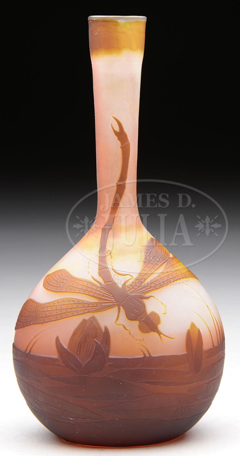 GALLE DRAGONFLY VASE. Galle cameo banjo vase has brown and amber cameo pond with lily pads and flowers with an amber colored dragonfly hovering above. Signed on the side in cameo “Galle”. SIZE: 6-1/4″ t. CONDITION: Very good to excellent. 5-68138 (500-1,000)