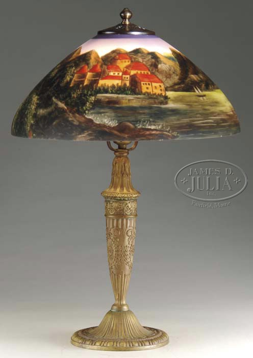 REVERSE PAINTED TABLE LAMP. Nice reverse painted table lamp attributed to Pittsburgh is decorated with a castle along a river or pond with sailboat in the pond and mountains and forests in the background. All against a lavender sky. Shade rests on a gold colored decorated metal base. SIZE: Shade is 15-1/2″ dia. Lamp is 22-1/2″ t. CONDITION: Very good to excellent. Base and shade most likely did not start life together. Heat cap and shade ring are replacements. 5-61993 (400-600)