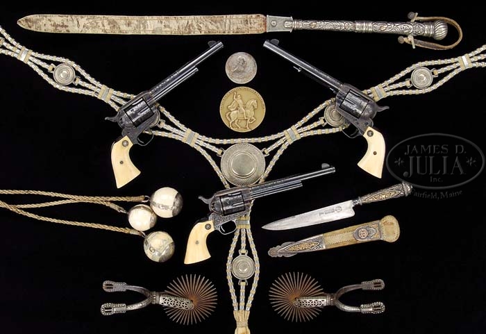 *EXTRAORDINARY KORNBRATH ENGRAVED GOLD INLAID COLT SINGLE ACTION ARMY REVOLVER, ONE OF A TRIPLET OWNED BY THE PRESIDENT OF ARGENTINA, MARCELO T. ALVEAR. SN 343200. Cal. 44 Russian & S&W Spcl. Blue & color case hardened with 7-1/2″ bbl, full thick front sight and 1-line Hartford address with caliber marking “RUSSIAN AND / S&W SPECIAL 44” on left side. Left front side of frame has 2-line 3-patent dates and rampant Colt without a circle. Mounted with early, period of revolver, smooth 2-pc ivory grips with deep rampant Colt medallions that have left & right sides. Accompanied by their orig matching numbered rampant Colt hard rubber grips. Revolver is beautifully engraved by master engraver Rudolph Kornbrath in his readily identifiable style of flowing floral, foliate & vine patterns. Frame has about 80% coverage with feather patterns on top strap. Top of backstrap has a fine fan pattern with a crosshatch triangle in the center, with a small foliate arabesque pattern and zig zag borders which extend completely around buttstrap. Toe of buttstrap and trigger guard are engraved with foliate arabesque patterns which are also on the shoulders of trigger guard and sides of the ears of backstrap. Foliate patterns extend up over the bbl and terminate in front of the address, with matching patterns around muzzle. Bbl has a fine gold band inlay in front of frame which extends forward to a point ahead of bbl address. Ejector rod housing has a fine climbing leaf pattern. Cyl is engraved on lands between the flutes with bowtie & foliate patterns and a narrow gold band around rear edge with an adjacent snake & dot pattern. SN is in usual place on bottom of frame and was observed on right side of front & back straps under the grip. Last four digits of the SN are on rear face of cyl. Screws are all high polish blue with no evidence of ever having been turned. The orig matching pair found in Argentina, SN’s 343199 & 343200, are pictured in full color on pp. 542 & 543 of The Colt Engraving Book Volume Two, Wilson. They are also pictured in full color on p. 146 of Steel Canvas, Wilson. Accompanied by a Colt factory letter which identifies this revolver, as found, except the type of stocks are “not listed”, which usually indicates the type of stocks being installed at the factory at the time of production which, in this case, would have meant rampant Colt hard rubber grips. Letter indicates it was factory engraved “Special engraving with gold inlay”. Shipped to Don Alfredo Gottling, Buenes Aires, Argentina on Dec. 23, 1921 in a shipment of three same type guns. Don Alfredo Gottling was Argentina’s greatest firearms importer & dealer with his shop in Buenos Aires called “La Portena”. The shop was established in 1857 and remained in business until 1972. La Portena Gun Shop imported only the finest, highest quality firearms from all of Europe and the United States and catered to the highest rungs of Argentinian society. The shop was located at 611 Rivadavia which is almost at the corner of Florida Ave. and would have been very convenient for the soon to be President to stop by on his way to government house, which he is reported to have done 15-20 days a month, to see what new merchandise had arrived. President Alvear was a serious firearms collector and a world champion pistol shooter. It is not known as of this writing whether these three revolvers were ordered by President Alvear or if Don Alfredo Gottling simply ordered them for stock and President Alvear bought all three of them, or if they had been intended as a gift to President Alvear. This revolver and its consecutive numbered companion #343199 were discovered in Argentina and purchased from the estate of Marcelo T. Alvear who was the President of Argentina 1922-1928. Marcelo Torcuato de Alvear (1868-1942) was an Argentine statesman & diplomat who was the Ambassador to France 1917-1922 and became the President of Argentina in 1922, leaving office in 1928. In 1931, for political reasons, he was barred from again running for President but was allowed to run again for the Presidency in 1937 but was defeated. The original consecutive numbered pair 343199 & 343200 were purchased together and sold to Dr. Joseph A. Murphy in the 1990’s, where they remained until about the year 2000 or 2001 when they were sold through Little John’s Auction Service to the consignor. Consignor obtained letters for these two revolvers and upon learning that they were two of a three gun shipment, he immediately begain a search for the third matching single action. By deductive reasoning he searched the Colt records and found the SN of the third gun to be #343202, one number off from the above pair. This led to a grueling international search for the missing “triplet”. In August 2008 consignor was able to purchase the third triplet from a wealthy ranching family about 1,000 miles south of Buenos Aires in the Patagonia area. He obtained clearances and arranged for an export permit, then flew to Argentina to negotiate the sale, which he concluded successfully, returning the lost triplet to the United States in August 2008. This revolver, SN 343200, is being sold in this auction as a stand alone item with the successful bidder having the option to purchase the other two matching single actions from the 1921 shipment pictured here, for the same price each. If the buyer elects to purchase all three revolvers the orig paperwork and research material will accompany. The decorative items accompanying this revolver in the photographs in this catalog are for display only and are not included in the sale of this revolver. However all these items were the property of President Alvear. PROVENANCE: Don Alfredo Gottling, Buenos Aires, Argentina; Argentine President Marcelo T. Alvear; Dr. Joseph A. Murphy; Littlejohn’s Auction Service. CONDITION: Extraordinarily fine, all matching except grips which are unnumbered. Overall retains virtually all of its orig factory finis