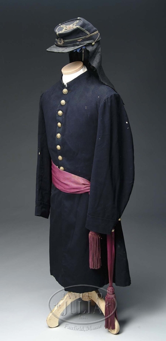 OUSTANDING AND RARE IDENTIFIED UNIFORM GROUPING OF CAPT ALBERT M. TYLER OF 27TH REGIMENT NY VOLUNTEERS. This grouping consists of Capt Tyler’s frock coat, sash, vest, a signed CDV of him wearing this coat, his officer’s kepi with Havelock and 6th Army core badge. There are 2 pairs of captain straps a pair of major straps. This is a wonderful attic found grouping with no restoration. Frock coat has all classic civil war features including velvet lined collar. Bulbous elbows are 9 1/2” across, cuffs are 5” across. Eagle staff buttons adorn the coat as they do on the vest and the officer’s kepi. Coat is heavily quilted, tails have lined pockets, lining of skirt is typical dark green material. The officer’s kepi here is outstanding. It is the only kepi we have seen with an improvised orig Havelock constructed from polished cotton. Kepi has a padded quilted lining and top with an indiscernible makers mark on top. Tarred sweatband is intact. Chinstrap has 2 eagle staff buttons. An orig embroidered 6th army badge with orig red background sits atop officer’s braid on top of kepi. An embroidered US staff insignia 1 1/2” across in bullion wreath sits on front of hat. Typical dark blue wool vest that would have been worn with Union Officers coat. Coat has 9 extra quality back marked US Staff Officers buttons. Coat has 3 pockets lined with light brown cotton. Same light brown material is used on backing of vest. A 2 prong iron tightening buckle is found on back of vest, dated 1855. Sash is typical red silk faded to purple. The orig straps should be resewn to coat as seen in CDV. This is a wonderful opportunity to obtain an untouched officer’s kepi with orig staff insignia and core badge along with field grade officer’s frock coat, sash and vest. CONDITION: Coat and vest still exhibit rich blue color. Several moth holes, three largest holes being about 1” x 1/2”. Scattered moth tracking over much of the wool surface. Linings very good and sound with some tearing and fraying. Sash is faded with some soiling. Kepi exhibits similar color and moth damage. Havelock is excellent. Sweatband soiled. Lining deteriorated and frayed but still 70% or more intact. Padding still present. Inside top of hat appears to be makers mark but unreadable. 4-56248, 4-56260 JS276 (15,000-25,000)