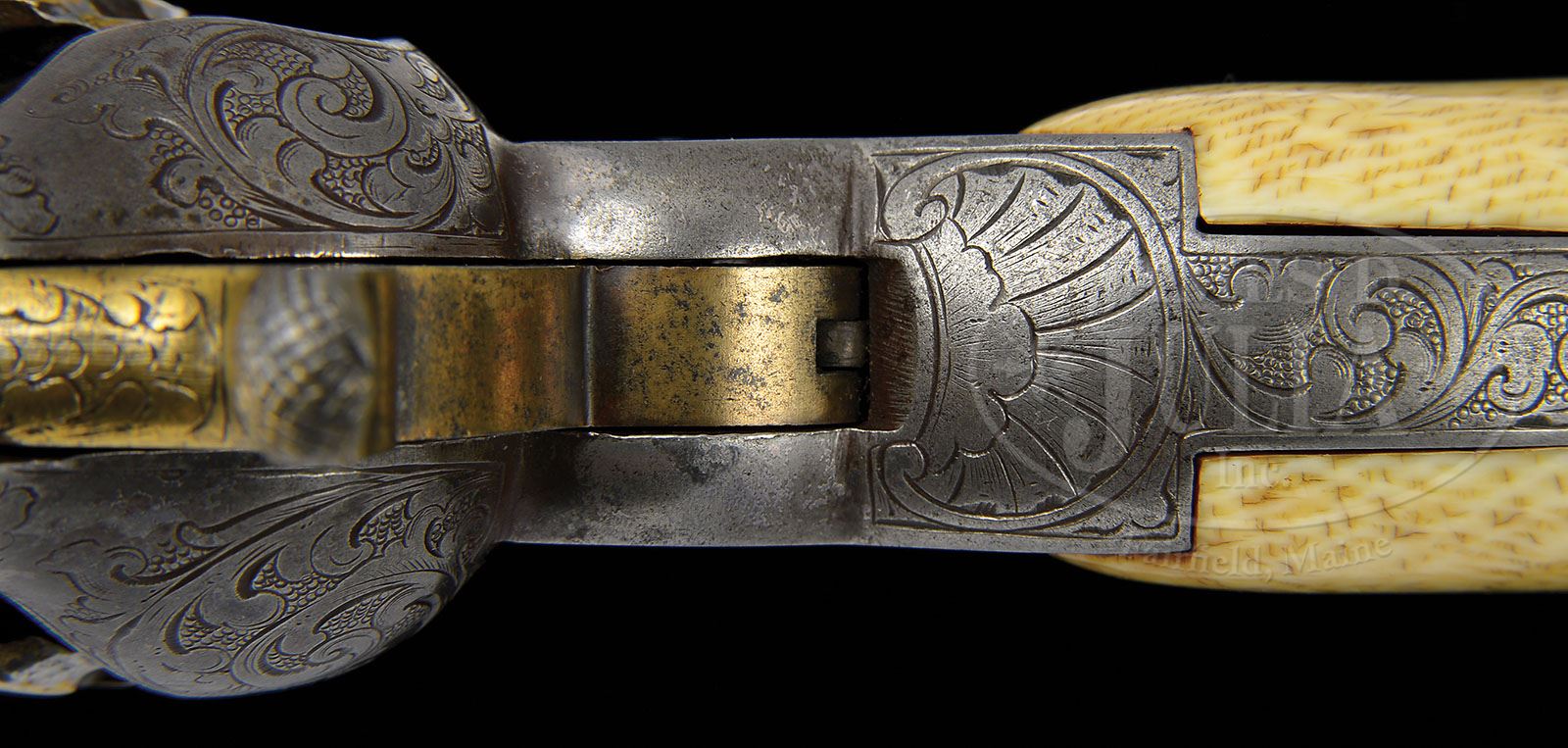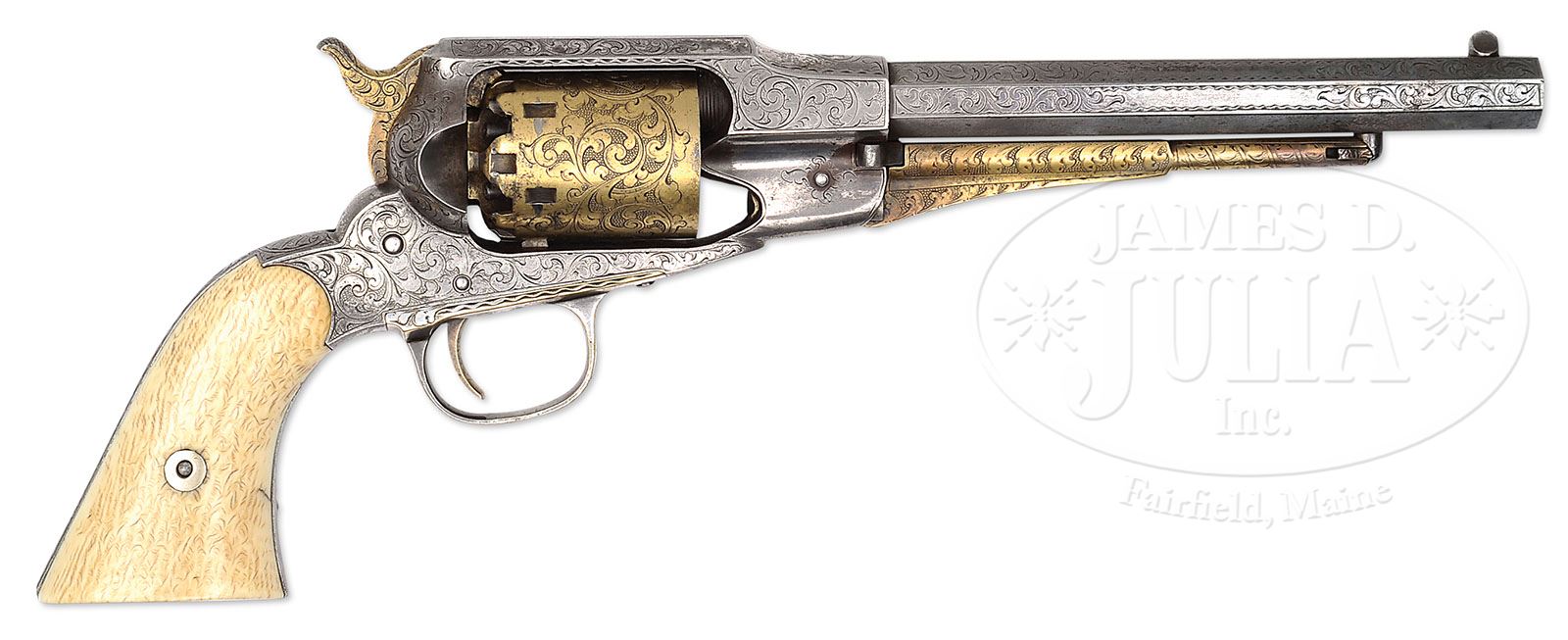 RARE CASED ENGRAVED REMINGTON NEW MODEL NAVY PERCUSSION REVOLVER. SN 28138. Cal. 36. Usual configuration with 7 1/2″ oct bbl, pinched post front sight and grooved top strap rear sight. Mounted with smooth 2-pc ivory grips, matching number to this revolver. Revolver is silver and gold finish and beautifully engraved by L.D. Nimschke in his distinctive flowing foliate arabesque patterns with pearled background. Frame has nearly full coverage with a shell pattern at top of backstrap and matching foliate arabesque patterns down backstrap, buttstrap and trigger guard. Matching engraving patterns extend over top 5 flats of bbl and on rammer handle. Cylinder is matching engraved around circumference as are both sides and top edge of hammer. Cylinder, rammer handle and hammer are gold-washed. Accompanied by an orig red velvet lined mahogany casing, compartmented in bottom for revolver & orig double-sided dog & birds copper flask, steel 2-cavity bullet mold with sprue cutter, L-shaped nipple wrench, orig mushroom shaped brass handle steel cleaning rod, orig packet of 6 combustible cartridges, lacquered Fowler cap tin and a functioning key. Remington Navy revolvers were widely used during the Civil War and are rarely found with high orig condition. Engraved & cased models are a true rarity, with silver & gold features extraordinarily rare. PROVENANCE: Michael Leff Estate Collection. CONDITION: Extremely fine. Overall retains virtually all of its orig silver plating on bbl & frame showing wear only on the recoil shields and front & backstraps. Rammer handle, cylinder & hammer retain virtually all of their orig gold wash while the trigger retains about 50% thinned gold wash. Grips are extremely fine with a mellow ivory patina. Mechanics are fine, strong bright bore with scattered fine pitting. Case has a fine crack in the lid, otherwise is sound with usual handling & storage nicks & scratches and retains most of an old restored finish. Interior is moderately faded and soiled inside the lid, heavily faded and soiled in the bottom. Partitions are sound. Flask and all accessories are fine. 4-49631 JR1 (15,000-25,000)