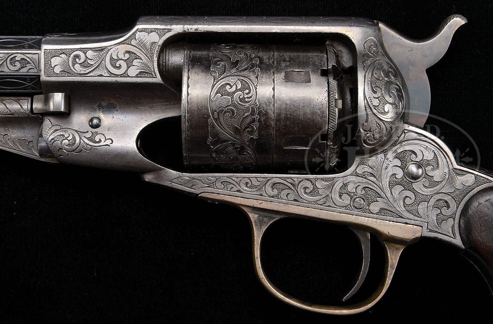 CASED ENGRAVED CONSECUTIVE NUMBERED PAIR OF REMINGTON SINGLE ACTION BELT MODEL CONVERSION REVOLVERS. SN 3158 & 3159. Cal. .38RF. Both revolvers are virtually identical with silver finish, 6-1/2″ oct bbls, silver half moon front sights and silver-plated brass trigger guards. Mounted with 2-pc smooth rosewood grips matching numbered to their respective revolvers. Revolvers are identically engraved by master engraver L.D. Nimschke with about 80% coverage foliate and geometric patterns with fine pearled background on frames which extends over 7 of 8 flats of bbls, down backstraps, on buttstraps and trigger guards. Cylinders are engraved in matching patterns with about 40% coverage. Accompanied by a beautiful oak box customized from an English cutlery casing. Interior is black velvet-lined and French fitted in bottom for the two revolvers & an oak cartridge block with holes for 63 cartridges containing 15 orig copper-cased cartridges. According to Flayderman’s Guide to Antique American Firearms, there were only 2,500 to 3,000 of these scarce revolvers produced in the period 1865-1873. While examples of this model are occasionally encountered, very few were engraved with silver finish pieces being extremely rare & consecutive numbered sets nearly unknown. PROVENANCE: Michael Leff Estate Collection. CONDITION: Very fine to extremely fine, all matching inc. grips. Overall both revolvers retain most of their orig silver finish. Grips on both revolvers show light to moderate handling & use nicks & scratches and retain sharp edges with most of their orig finish remaining. Mechanics are fine, strong sharp bores with very fine pitting. Case is extremely fine. 4-49651 (30,000-45,000)