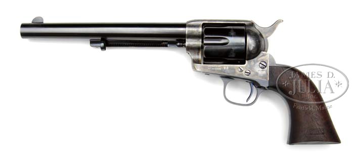 MARTIALLY MARKED COLT CAVALRY SINGLE ACTION ARMY REVOLVER. SN 10319. Cal. 45 Colt. Blue & color case hardened with 7-1/2″ bbl, full front sight and re-rolled script 1-line address. Bottom of bbl has a small “P” and “A” (Orville W. Ainsworth) proof. Left side of frame has 2-line patent dates and a tiny “U.S.”. Ejector rod housing is first type with bullseye ejector rod head. Mounted with a 1-pc modern replacement walnut grip with spurious “OWA” (Ainsworth) cartouche on left side. The small “A” proofs were observed on bbl as noted, trigger guard, cyl and top of back strap. Base pin is a modern reproduction. The SN of this revolver is only two numbers away from a known New York Militia issued Cavalry Colt. This revolver has undergone a complete professional restoration of the quality of Tommy Haas at his finest or Doug Turnbull. PROVENANCE: Fred B. McDonald Estate Collection. CONDITION: Very fine. Overall retains virtually all of this fine professional restoration with bright blues and strong but faded case colors. Grip is crisp, mechanics are crisp, bright shiny bore. 4-41408 JR105 (4,000-7,000)