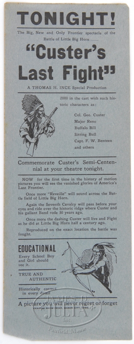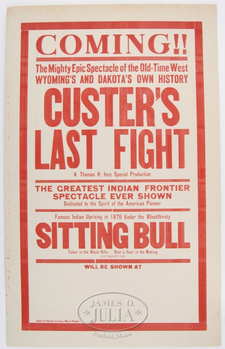 LOT OF FOUR MOVIE PROMO POSTERS. Various printed promotional material advertising the semi-centennial, 50th anniv. of “Custer’s Last Fight” motion picture. This highly publicized spectacle boasted a cast of 200 and was shot on location in MT. & WY. Handbill measures 4-1/2″ x 12″ on blue paper with black ink in block letters. Dbl-sided poster on newsprint is in blue & red ink illus. with scenes of troopers & Indians, measuring 9″ x 17-1/2″. Sngl-sided poster on cardboard is printed in block-lettered red ink & measures 14″ x 22″. Large format poster, on thin, yellow paper with simple black block lettering measures approx. 28″ x 43″. SIZE: As above. CONDITION: Generally good with some tears along fold lines and chipping at the corners. 4-32567 WD61 (100-400)