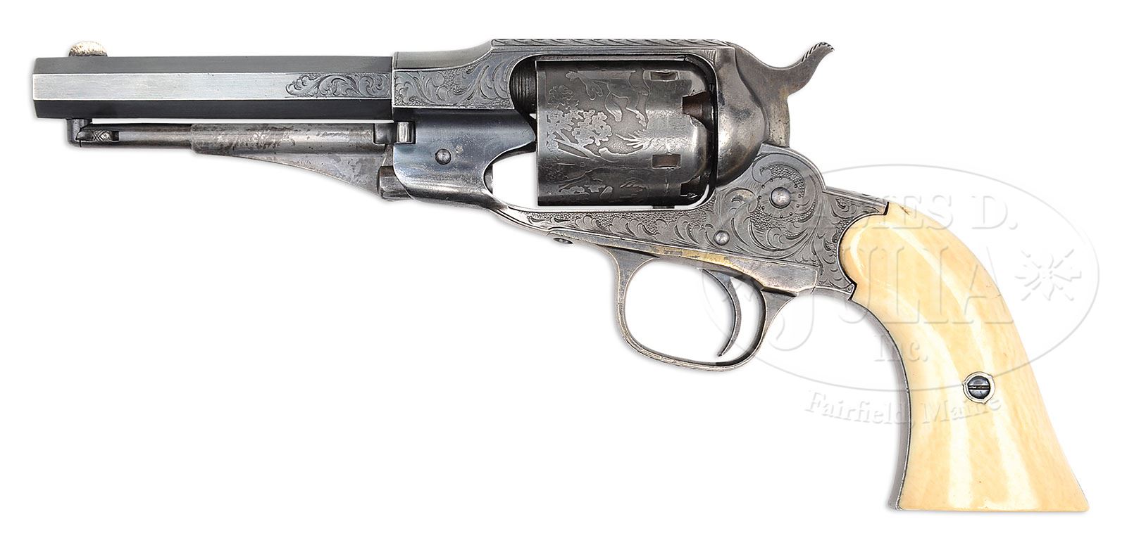 RARE CASED ENGRAVED REMINGTON NEW MODEL POLICE DA PERCUSSION REVOLVER. SN 152. Cal. .36. Blue finish with 4-3/8″ oct bbl. German silver half moon front sight and usual 3-line address. Engraved specimens are rarely encountered, with cased examples very rare. Mounted with smooth 2-pc ivory grips matching numbered to revolver. Revolver is very nicely engraved in New York style from the Nimschke shop with about 75% coverage on frame, backstrap, buttstrap and trigger guard. Trigger guard is silver-plated brass. Cylinder is usual 5-shots with etched scene of Confederate & Union Cavalrymen charging each other, separated by large trees. Accompanied by an orig blue velvet-lined mahogany casing, compartmented in bottom for revolver, single-sided Colt style eagle & shield flask, blued steel 2-cavity Remington mold with sprue cutter, packet of 5 combustible cartridges marked “Police Pistols”, and tin of UMC caps. There were approximately 18,000 of these scarce revolvers produced in the period 1865-1873. PROVENANCE: Michael Leff Estate Collection. CONDITION: Very fine to extremely fine, all matching including grips. Bbl retains 96-98% strong orig blue with frame retaining about 80% strong blue. Trigger guard and backstrap are mostly a gray patina. Trigger guard retains about 90% orig silver. Cylinder is mostly a thin blue patina with sharp etched markings. Grips are sound with good edges and show a wonderful mellow ivory patina. Mechanics are fine, brilliant shiny bore, may be unfired. Case is sound with a series of deep scratches and small grain check in lid. Overall retains most of its orig varnish. Interior is lightly faded and soiled. Flask and accessories are all fine. 4-49644 (18,000-24,000)