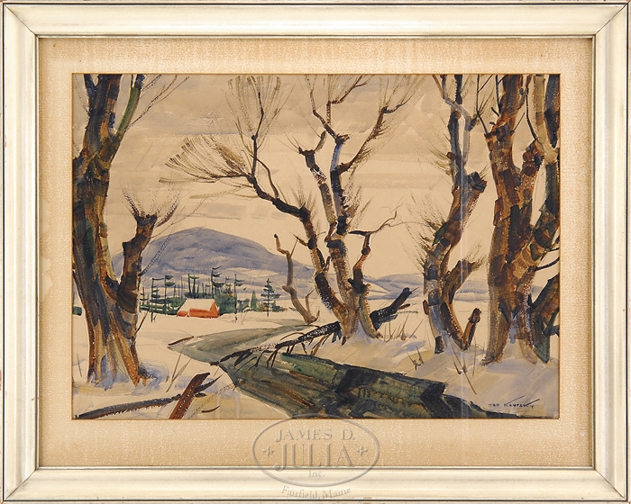 TED KAUTZKY (American, 1896-1953) WINTER SKETCH. Watercolor winter scene shows a stream winding to red barn below a blue hill. Signed lower right “Ted Kautzky”. Housed in a white painted molded wood frame with matte. On reverse is a label indicating that it was painted in 1953. SIZE: Sight: 19-1/2″ x 27-3/4″. CONDITION: All over brown toned, otherwise good. 9-96963 (2,000-3,000)