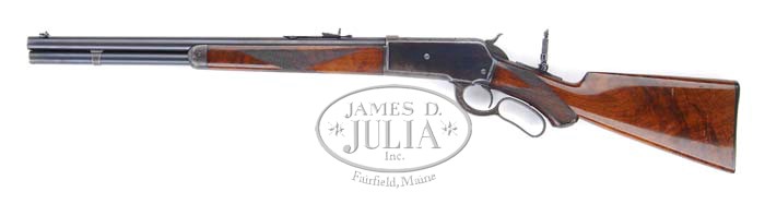 *RARE WINCHESTER MODEL 1886 DELUXE SHORT RIFLE. SN 148875. Cal. 45-90. 20″ rnd bbl, full magazine, combination front sight, sporting rear with set screw, coarse knurled post tang-mounted sight. Mounted with fancy “XXX” walnut, H-style checkered forend, H-style checkered pistol grip with Winchester hard rubber grip cap, Winchester hard rubber shotgun butt. Inspection of lower tang reveals assembly no. “16 XXX” & matching “16” can be found in top tang channel of stock. CONDITION: Fine. Bbl & magazine tube retain 85-90% orig blue with thinning in chamber area & a few spots of fine surface oxidation. Receiver retains 50-60% orig blue with wear on bottom, top & right side blending with silver & brown patina. Hammer shows faded orig case colors. Lever has silvered & mixed with brown patina. Stock is solid, with minor chip on upper right side, usual nicks & dings, slightly worn checkering & retains most of its piano varnish finish. Forend is sound with moderately worn checkering, usual nicks & scratches, hand-worn patina across belly with balance piano varnish finish. Mechanics are crisp; shiny bore with some minor scattered pits. 4-35852 BDT258 (15,000-20,000)