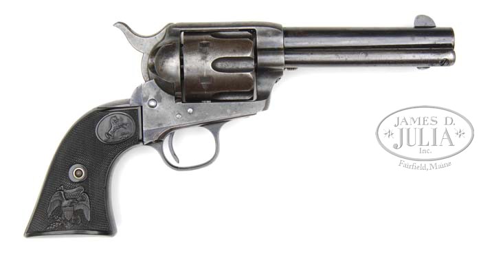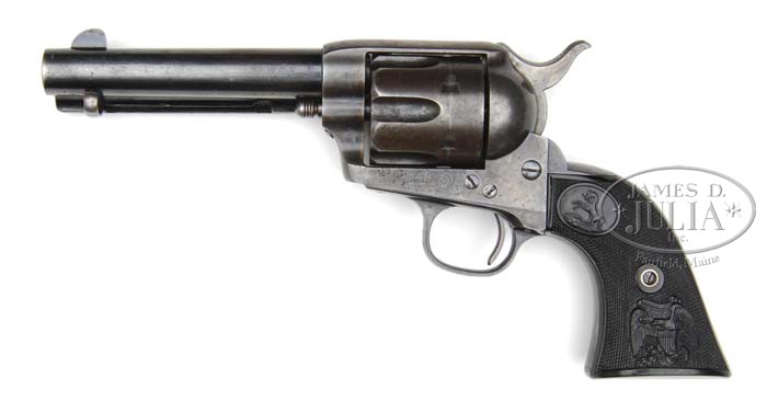 BLACK POWDER FRAME COLT SINGLE ACTION ARMY REVOLVER. SN 135754. Cal. 32 WCF (32-20). Blue & color case hardened with 4-3/4″ bbl, very slightly altered front sight and 2-line address with caliber marking on left side. Bottom of bbl has a tiny “32” underneath the base pin. Left side of frame has 2-line 3-patent dates and rampant Colt in a circle. Mounted with rampant Colt/Eagle hard rubber grips. SN was observed in the usual three places, on the frame, trigger guard & buttstrap with last two digits of SN on rear face of cylinder. Accompanied by a Colt factory letter identifying this revolver, as found, in 32 caliber with 4-3/4″ bbl, blue finish and type of grips not listed, shipped to Powell & Clement, Cincinnati, OH on Oct 29, 1890 in a 1-gun shipment. According to Colt Peacemaker Encyclopedia, Cochran, there were 29,812 single actions produced in caliber 32-20 of the approx. 357,800 produced from 1873 to 1940. Only a few of those were produced in 4-3/4″ bbl. PROVENANCE: Wes Adams Estate Collection. CONDITION: Fine, all matching except bbl & grips which are unnumbered. Bbl retains about 70% strong orig blue with holster wear on left side and top near the frame; ejector housing retains 65-70% orig blue, strong in gullets, thin on outer radius; frame & hammer retain strong case colors in sheltered areas with balance faded to silver; trigger guard retains about 50% orig blue with front strap a blue/gray patina; backstrap has blue at the top and on the buttstrap with body of backstrap a blue/gray patina; cyl is an overall blue/gray patina; grips are sound showing light diamond point wear and probably are not orig to this revolver. Hammer is not solid in safety notch, otherwise mechanics are fine; bright shiny bore with scattered fine pitting. 4-44705 JR215 (4,000-6,000)