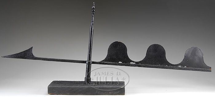 WROUGHT AND SHEET IRON HARPOON WEATHERVANE. Late 19th, early 20th century, New England. This nice folk art example of a New England weathervane fashioned in the shape of a harpoon point. Sheet iron tail section fashioned as “waves”. The whole with a central spire. Mounted on a painted wood base. SIZE: Vane: 16-3/4″ h x 44″ l. CONDITION: Generally good with some deterioration to sheet iron. 9-26433 (500-700)