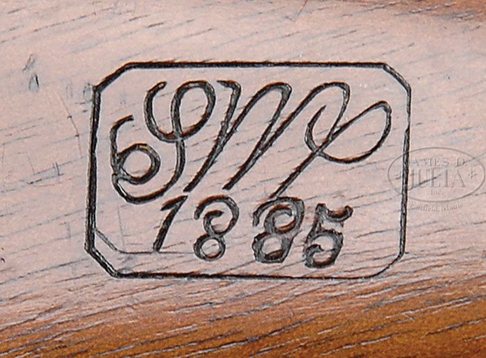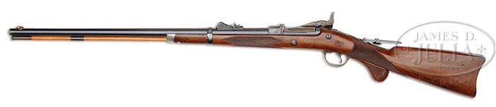 RARE MODEL 1875 SPRINGFIELD 3RD TYPE OFFICER’S MODEL TRAPDOOR SINGLE SHOT RIFLE. Cal. 45-70. Beautiful 3rd Type officer’s model with 26″ rnd bbl, gold washed beach’s combination front sight, ski jump ladder rear sight, graduated to 1200 yd, marked with an “R” on the left side and on the ladder. Breech block has usual 1873 markings and lockplate has a small eagle and “US Springfield”. It has single-set trigger. Rifle is mounted in very nicely figured American walnut half stock with coarse checkered forearm and straight grip with added checkered walnut grip adapter and an 1873 style buttplate without trap. Forend tip is silver plated pewter in branched foliate style. Top of wrist is mounted with a graduated friction tang sight with 3-1/2″ staff. Left side of wrist has a crisp, clear “SWP/1885” cartouche and bottom of stock, below checkering has “P” stock inspector’s cartouche. Lockplate, hammer, breechblock, top front of receiver, bbl band, forend cap, trigger bow and buttplate tang are very nicely engraved in flowing foliate arabesque patterns. Breech plug tang is engraved with flower blossoms. It has its orig brass tipped hickory cleaning rod. Brass on cleaning rod was never nickel plated. According to Flayderman’s Guide to Antique American Firearms there were only about 100 of these last style Officers’ model rifles produced. CONDITION: Extremely fine plus. Appears to be new and unfired. Bbl retains 99%+ strong, orig blue and bbl band about 98% bright blue. Receiver also retains 99%+ strong, orig blue. Buttplate retains about 95% bright, orig blue with only little wear on heel. Lockplate, hammer, breechblock, thumb lever and trigger guard retain about all of their orig case colors, bright in most areas beginning to fade elsewhere. Forend cap retains virtually all of its orig silver. Stock is sound with a few minor nicks and scratches and retains virtually all of its orig hand-rubbed oil finish. Mechanics are crisp, brilliant shiny bore. 4-46799 (35,000-40,000)