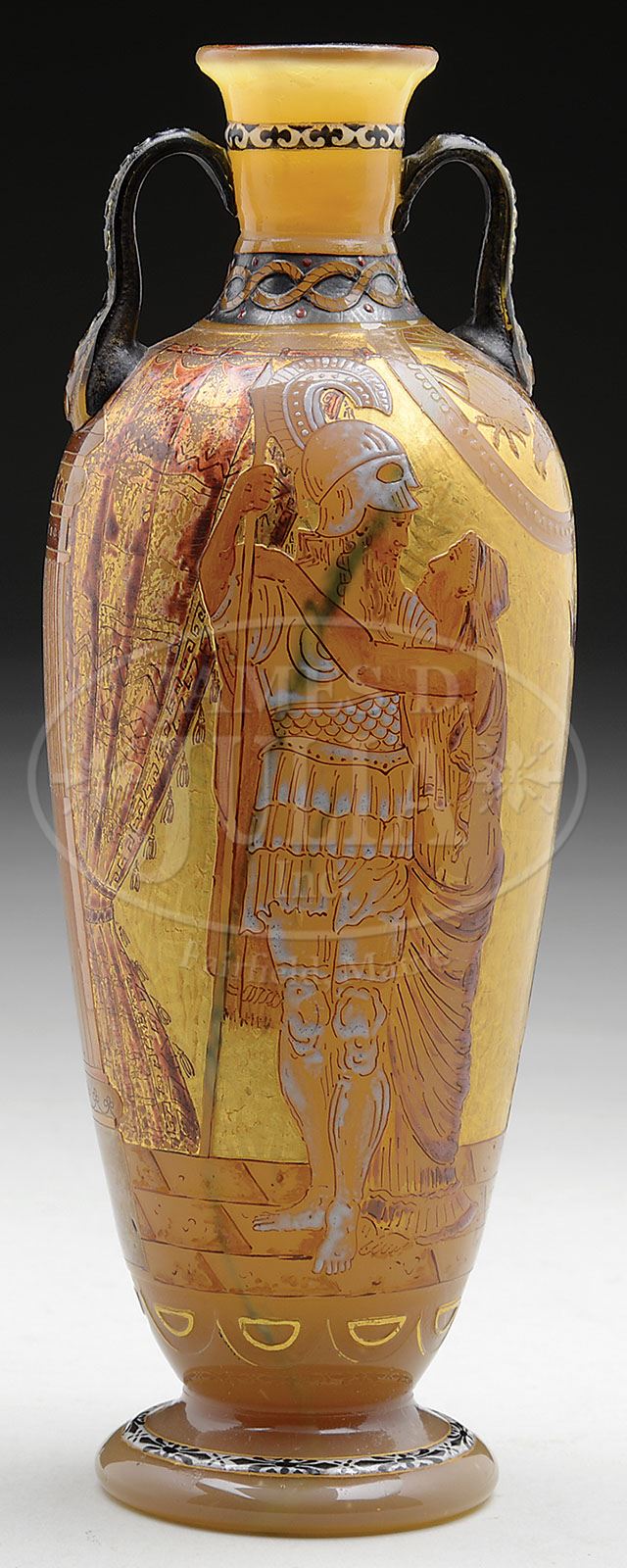 BURGUN & SCHVERER VASE. Classic form vase depicts a gladiator with maiden each being nicely enameled in colors of white and pink. They are set against a gold and cutback ground with designs of drapes, columns and animals; the influential colors being gold, burgundy, green and white. This design is further enhanced on foot and collar with a black and white fleur-de-lis. The vase is finished with two applied glass handles that are further decorated. All of this is on glass that is designed to look like marble with internal green streaks. Signed “Meisenthal B.S. & Co. This vase is based on a story of Walter Crane (English 1845-1915) who is considered the most prolific and influential children’s book writer of his time. SIZE: 9” t. CONDITION: Very good to excellent. 5-66063 (5,500-6,500)