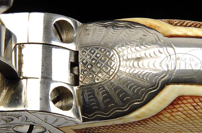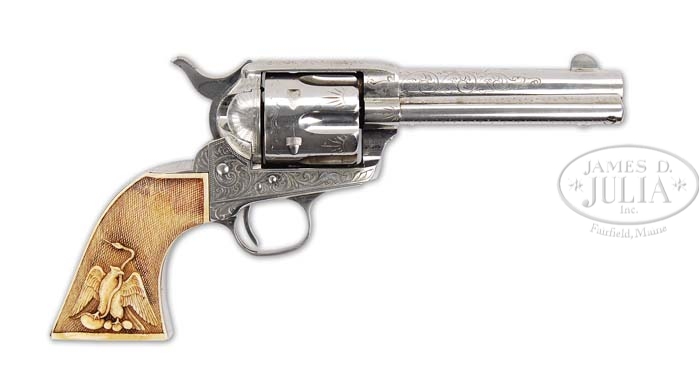 FINE CUNO HELFRICHT ENGRAVED COLT SINGLE ACTION ARMY REVOLVER. SN 126587. Cal. 45 Colt. Nickel finish with 4-3/4″ bbl, full front sight and 2-line address. Left side of frame has 3-line patent dates. Serial number was observed in usual places on bottom of frame, trigger guard & buttstrap. Left side of frontstrap & right side of buttstrap are stamped with the assembly number “248” which number is also found on bottom of bbl under ejector rod housing in tiny numbers. Also was observed on inside gullet of ejector rod housing and on face of cyl around base cylinder bushing. Right rear web of trigger guard has a partial “&”, all of which, combined with the assembly number, indicates a factory restored finish. Mounted with spectacular 1-pc ivory grip having full checkered background with deep relief carved Mexican eagle on each side. Carving is extremely fine and in great detail. Revolver is engraved by Cuno Helfricht with about 75% coverage on frame, full coverage on sides of foliate arabesque patterns which extend down over shoulders of trigger guard and has Mr. Helfricht’s trademark sunbursts on recoil shield & loading gate. Top strap is engraved in zig zag & leaf patterns. Foliate arabesque patterns extend up the side of bbl with zig zag geometric patterns around bbl address to the front sight. Ejector rod housing is engraved with snake & dot patterns on outer radius and in top gullet. Backstrap has Mr. Helfricht’s typical sunburst pattern with light geometric patterns down backstrap & buttstrap with matching patterns on trigger guard. Cylinder is engraved with Mr. Helfricht’s sunburst patterns on lands between the flutes with a snake & leaf pattern around rear edge. Accompanied by a relined Smith & Wesson mahogany casing with black velvet lining recessed for revolver. PROVENANCE: Ted Knee Collection. CONDITION: Fine to very fine. Overall retains most of its factory restored finish with some slight dulling and a little milkiness to the nickel. Grip is a dark yellowing color and may have been stained purple or burgundy in the checkered areas. Mechanics are crisp, strong bright bore with scattered fine pitting. Case is fine. 4-36627 JR215 (10,000-15,000)