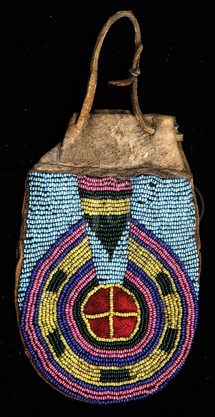 BLACKFOOT SEED BEADED HIDE POUCH. Hide pouch with one side having beaded panel with beads including light blue, rose, green, and blue. Sinew and thread sewn with red stroud cloth. Circa 1860-1870. SIZE: 7/1/2″ (including strap) x 3-1/2″ PROVENANCE: Purchased from Alexander Gallery; Private Collection, New York City. CONDITION: Good with nice patina, hide is well tanned & supple. 9-25809 (2,500-3,500)
