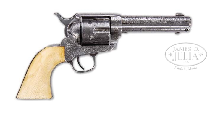 SCARCE EARLY NIMSCHKE ENGRAVED COLT SINGLE ACTION ARMY REVOLVER. SN 74589. Cal. 45 Colt. Early single action with 4 13/16″ bbl reduced from 7 1/2″ with replaced front sight, 1-line block letter address and 3rd type ejector rod housing with half-moon ejector rod head. Left side of frame has 3-line patent dates and the caliber is on the left front web of the trigger guard. It is mounted with old, probably original to this revolver, 1-pc ivory grip. Frame has full coverage L.D. Nimschke engraving with a large shell pattern on the left side of the frame, fan patterns on the recoil shield and loading gate with a diamond and dot pattern on the cylinder pin boss on the left front side of the frame. Top of the backstrap has Mr. Nimschke’s fan pattern with symmetrical dot patterns down the back of the frame. Topstrap is engraved with geometric patterns and a zig-zag pattern down the sight groove. Sides of the bbl and backstrap are engraved to match. Cylinder has deluxe engraving with foliate arabesque on the lands between the flutes and geometric patterns in the flutes. Mr. Nimschke also applied a wide oval geometric pattern around each of the cylinder stop notches with a double-incised line border at the rear edge. Accompanied by a Colt factory letter identifying this revolver in .45 cal. with bbl length and type of stocks not listed. Finished “soft” and shipped to J.P. Moore’s Sons, New York, NY on November 10, 1881 in a six-gun shipment. Shipped “soft” means that the revolver was destined to be engraved & finished outside the factory. CONDITION: About good. Original nickel finish remains under the ejector rod housing with the balance of the revolver a gray metal color showing moderate to heavy wear. Grip is sound with numerous age lines and retains a fine, dark, mellow ivory color. Hammer is not solid in the safety notch and the half-cock notch is missing, otherwise mechanics are fine. Strong bore with fine frosting. 4-38226 JR171 (10,000-15,000)