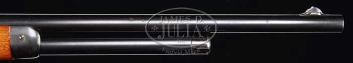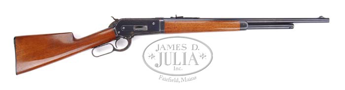 *OUTSTANDING WINCHESTER 1886 EXTRA LIGHTWEIGHT TAKE-DOWN RIFLE. SN 141426. Cal. 45-70. 22″ rnd bbl, rare 3/4 magazine tube take-down, pedestal front with Lyman ivory bead hunting sight & flat top sporting rear with set screw. Mounted with straight grain walnut with uncheckered straight grip & Winchester logo hard rubber shotgun style butt plate. Accompanied by Cody Firearms Museum letter identifying as 45-70 take-down rifle, 22″ rnd bbl, plain trigger, Winchester high-velocity sights, 3/4 magazine, shotgun butt with rubber butt plate, extra lightweight; received warehouse Aug. 16, 1907; shipped from warehouse Sept. 6, 1907, order no. 112208. CONDITION: Extremely fine. Bbl retains 95-98% orig blue with minor muzzle wear, the usual take-down marks on bottom of bbl & a couple of very minor thinning spots. Take-down ring has nearly all of its orig blue, with bottom starting to turn a brown patina. Receiver retains 90+% of orig blue, starting to thin at sharp edges and thinning & turning a blue/brown patina on bottom, small flake spot turned brown on right side below loading gate & bit of freckling on top of action & bolt. Hammer has nearly all of its dark orig case colors with faint silver line on left side. Lever has strong dark orig case colors on side, starting to thin to gray patina on bottom. Stock is sound with only a few minor nicks & handling marks, retaining most of its orig varnish with some wear in grip & flute of comb area. Forend is sound with just the typical minor nicks & dings, and retains most of its orig varnish finish. Forend cap has strong orig blue mixed with blue/brown patina on bottom. Mechanics are crisp with bright shiny bore, as gun has seen very little use. 4-35386 BDT54 (9,000-12,000)