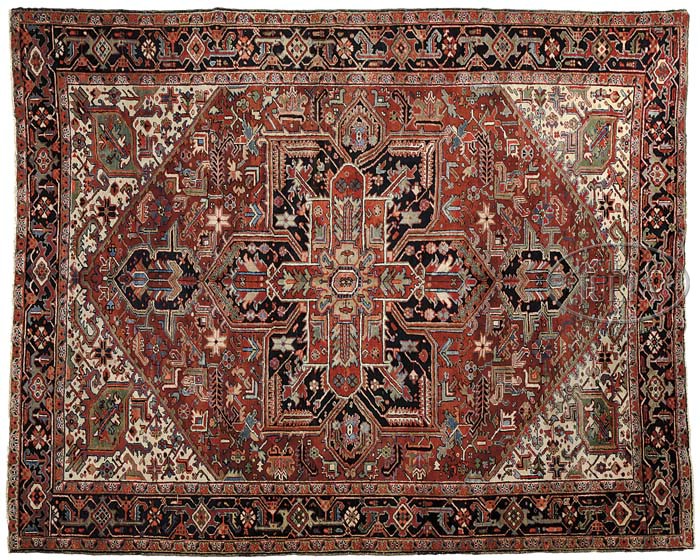 SEMI ANTIQUE HERIZ CARPET, NORTH PERSIA. First quarter 20th century. Central blue-black arabesque medallion on terracotta red ground with dense polychrome floral vinery within ivory spandrels. Blue-black main border with geometric stylized floral vinery. SIZE: 9’2″ x 12′. CONDITION: Pile and color overall good, one end of rug with insect damage. 9-24358 (2,500-3,500)
