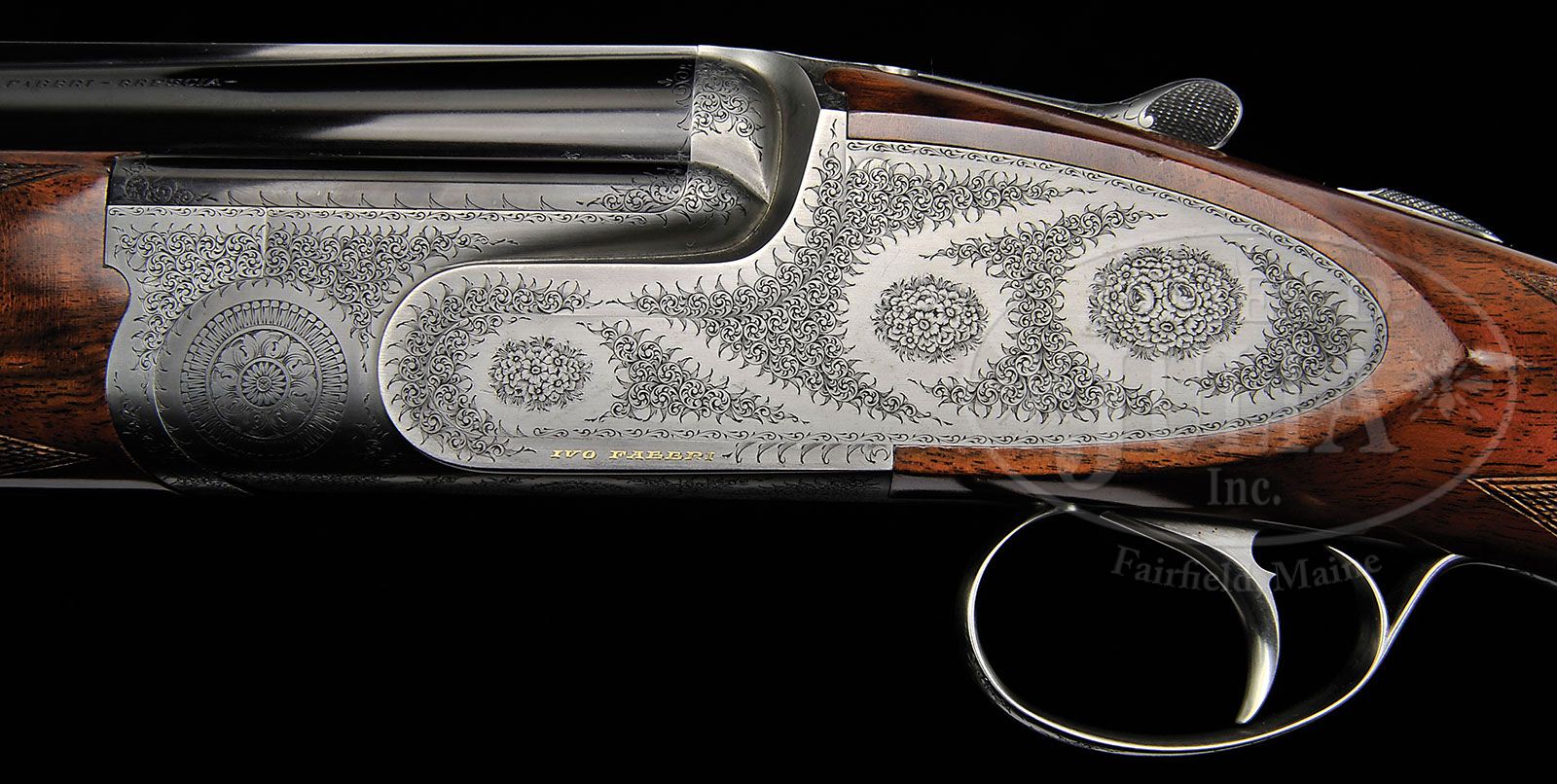 *VERY FINE IVO FABBRI OVER-UNDER PINLESS SIDELOCK SINGLE TRIGGER GAME GUN WITH CASE. SN 3536. Cal. 12 ga. 2-3/4″ Chambers. 26-3/4″ Demi-bloc bbls fitted with solid, concave rib are engraved “Ivo Fabbri – Brescia – ” and “Vacuum Arc Remelting Steel” on either side of rib. Bbl flat is stamped with 1998 Italian nitro proofs. Bbls are fitted with Briley flush mounted choke tubes. Sublime, French gray finished, low profile, O/U action fitted with pinless sidelocks, also features non-automatic safety (SICURA inlaid in gold), nicely chiseled fences, and non-selective single trigger. It is engraved with very fine, cleanly cut, classic, small scroll with rose bouquet highlights. “IVO FABBRI” is inlaid in gold on each side and on bottom of action. This fine engraving is by Creative Art, with individual craftsman’s signature, “G. Steduto” on trigger plate. SN is gold inlaid on tang of matching steel trigger guard. Finely marbled and nicely figured European walnut round knob buttstock measures 14-1/4″ over black leather covered pad. There is a vacant silver oval on toe line, and grip is checkered in point pattern with line borders. Full one piece ejector forend has Anson release in typical Fabbri wraparound steel tip. Bore diameter: top -.724, bottom -.724. Bore restrictions: Screw chokes. Wall thickness: top-.032, bottom -.032. Drop at heel: 2-1/16″, drop at comb: 1-3/8″. Weight: 6 lbs. 14 oz. LOP: 14-1/4″. High quality leather case with stitched leather corners is lined in burgundy cloth with large paper Fabbri label in lid. Case contains a pair of Torex screw drivers, Beretta snap caps, and Briley choke tube removal tool. CONDITION: Excellent, essentially as new, appears unfired. There are some assembly and disassembly marks on polished area of breech end of bbls, with only two or three of the faintest storage and handling marks on wood or metal, except for small area on right side of butt with a few light scratches. Case is excellent with a few minor handling marks on exterior. Straps and handle show minimal use. Interior cloth is excellent with some slight compressions. Current retail for Fabbri guns starts at $100,000.00. 4-48245 MGM200 (25,000-35,000)