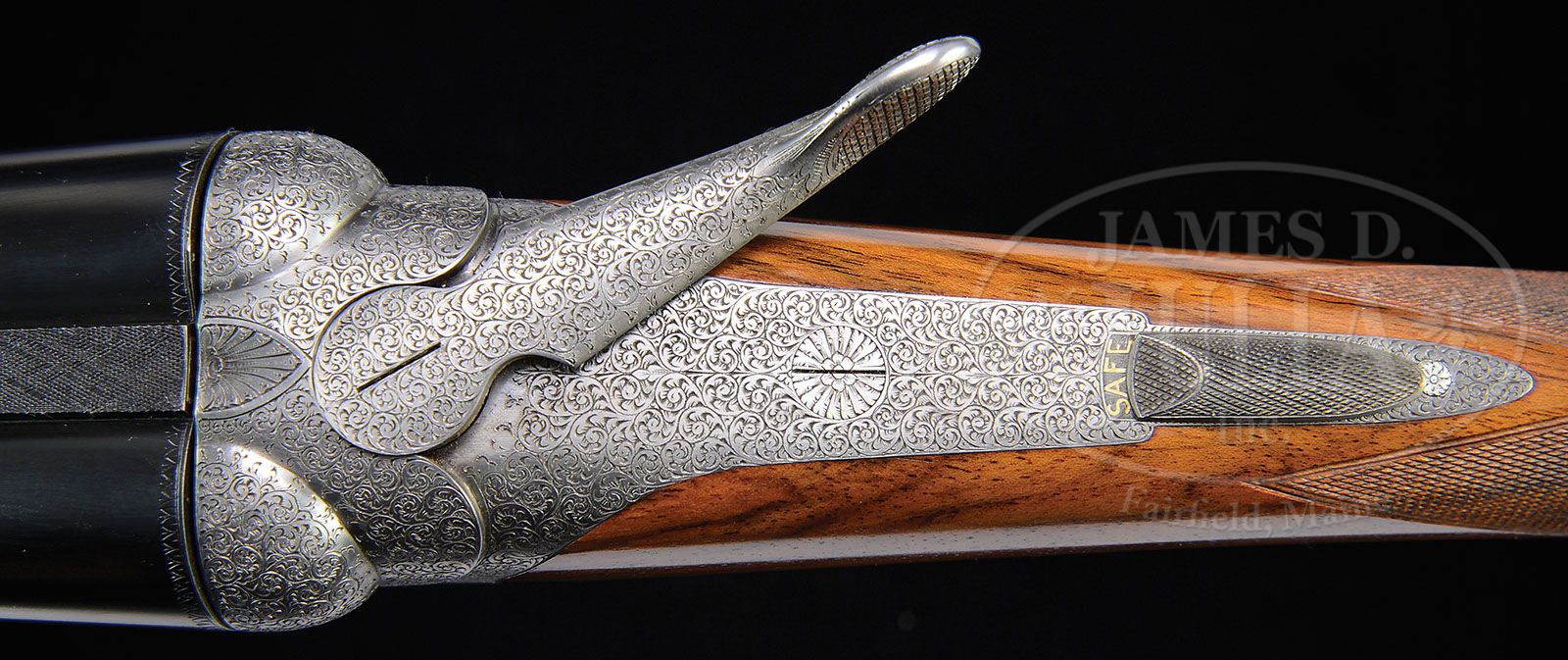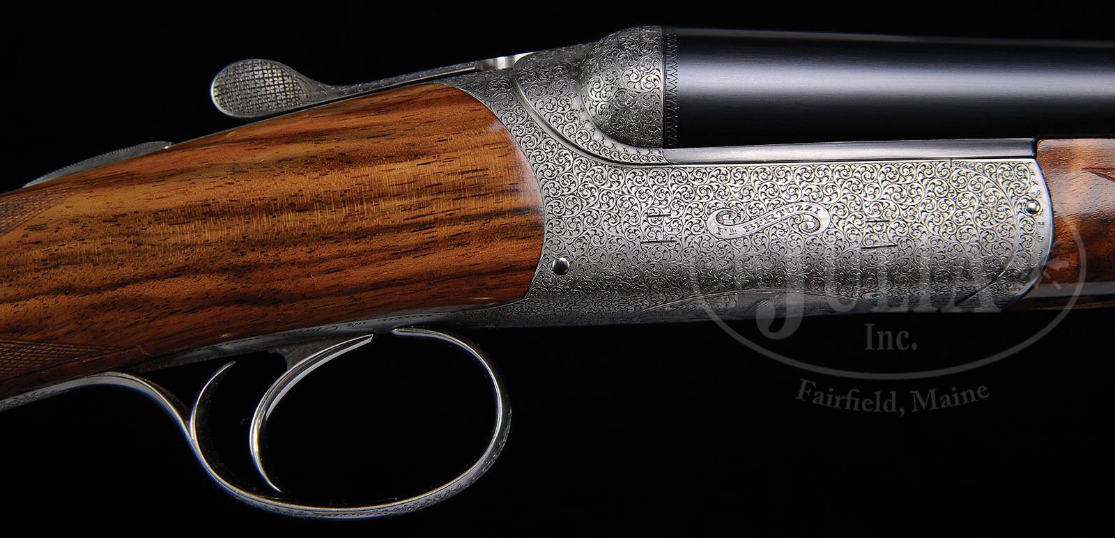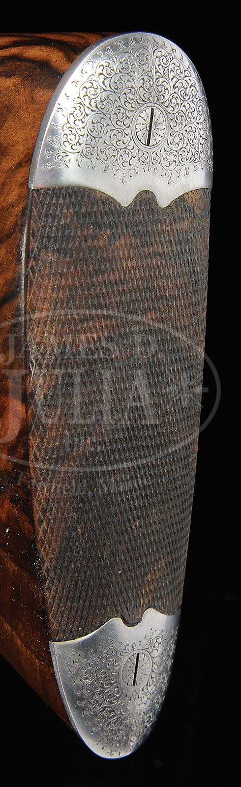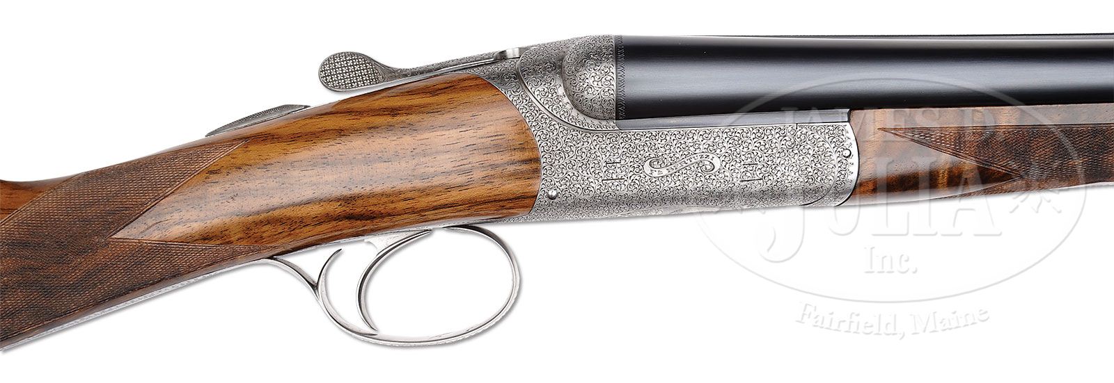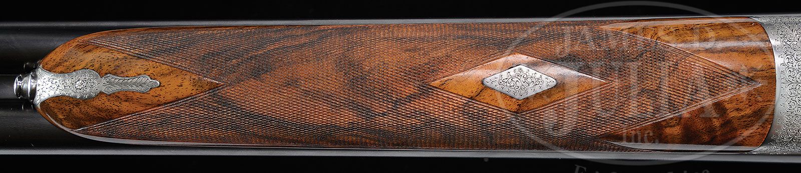 *EXCEPTIONALLY FINE DASSA ENGRAVED BERTUZZI ORIONE 20 GAUGE GAME GUN WITH CASE. SN 6092. (2003) Cal. 20 ga. 2-3/4″ Chambers. Finely struck 29″ chopper lump bbls with file cut, concave game rib, are engraved “Flli. BERTUZZI ITALY” on top of left bbl. Bbl flats and bottoms of bbls are stamped with 2003 Italian nitro proofs, SN and “Armi Bertuzzi”. Bottoms of bbls are also marked “New England Arms Co.” and “Kittery Point, ME U. S. A.” Nicely sculpted and filed, round body, coin finished boxlock action features non-automatic safety (SAFE inlaid in gold) and single non-selective trigger. Action is engraved with complete coverage, exceptionally well cut small scroll. “Filli Bertuzzi” appears in scrolled ribands on each side, and on bottom above finely rendered Bulino portrait of Brittany spaniel retrieving woodcock, the work of noted engravers to the trade, the Dassa Brothers whose signature appears on trigger plate. Scroll engraved trigger guard with vacant oval on bow has gold inlaid SN at grip. Exceptional, flesh-toned, beautifully marbled, and nicely flame figured European walnut (most likely Tessier French, as N. E. Arms was known to have a good supply, and would supply blanks on special order guns) straight grip buttstock measures 14-3/16″ over checkered wood butt with engraved steel heel and toe plates, and features well cut 32 LPI point pattern checkering with line borders. Matching splinter ejector forend has Anson release. Bore diameter: left-.625, right -.625. Bore restrictions: left -.020 (full), right -.007 (light mod). Wall thickness: left -.034, right -.032. Drop at heel: 2-1/4″, drop at comb: 1-5/16″. Weight: 5 lbs. 13 oz. LOP: 14-3/16″. Brown leather Nizzoli case with brass corners and canvas outer cover is lined in burgundy cloth with brown leather gold embossed Bertuzzi label stitched into lid. Case contains brass and cocobolo cleaning rod with brush, mop and jag, nickel-plated snap caps and oil bottle, with outer straps in covered compartment. CONDITION: Excellent,as new. Unfired, with only a few very minor marks in wood, mostly on right side of buttstock at rear of trigger guard bow. Case leather has some minor scuffs. Outer cover has considerable top grain covering deteriorated on trim. Interior cloth is excellent, as are accessories. A very fine gun, as were all from this renown firm. The Bertuzzi Brothers have retired and will no longer be creating these wonderful guns. 4-47078 MGM19 (23,000-33,000)