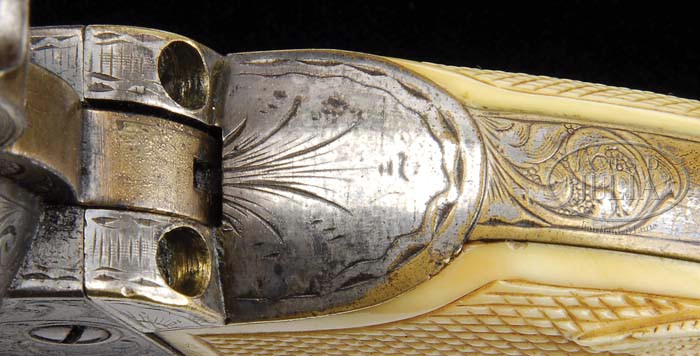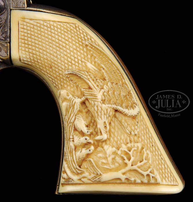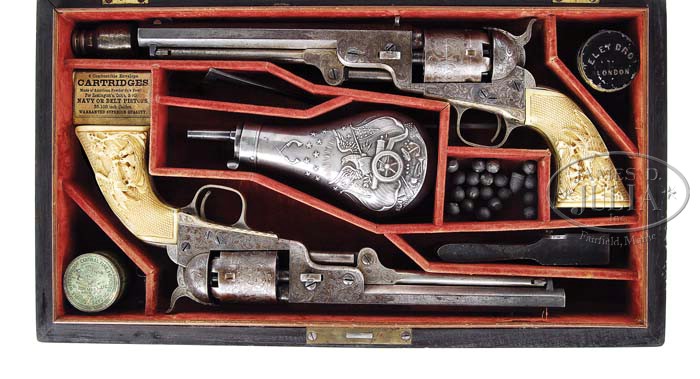 EXTRAORDINARILY RARE ROSEWOOD CASED ENGRAVED PAIR OF COLT MODEL 1851 NAVY PERCUSSION REVOLVERS. SN 147666 &147677. Cal. 36. Nearly identically engraved, this beautiful pair of 51 Navys has 7-1/2″ oct bbls, number 147677 has a brass pin front sight and number 147666 has a dovetailed Rocky Mountain front sight and small fixed rear sight at breech end of the bbl. Both have 1-line New-York U.S. America addresses. Serial numbers on both revolvers, in the four locations on bottom, are accompanied by small “E”‘s indicating they were to be engraved. They have large silver plated rnd brass trigger guards and back straps with extraordinary checkered 1-pc ivory grips with both left sides deep relief carved with the scene of an eagle feeding its young in the nest. Both grips have their matching full SN’s in pencil in back strap channels. It is the opinion of this cataloger that these grips were carved by Gustave Young. Both revolvers are silver finished with fire blued screws and are nearly identically engraved by Colt master engraver Gustave Young in his extra deluxe coverage with full coverage foliate arabesque patterns on the frames. Several of the scrolls terminate in flower blossoms. The frame on #147677 is engraved over the “COLTS PATENT”, which remains on #147666. The bbls are nearly identically engraved with full coverage on the lugs which extends onto the top side flats with a chip & dot borders around the addresses. Left side of lugs each have a scroll which terminates in a dog’s head. Rammer pivots are engraved to match. Unusually for Mr. Young, these revolvers also have his intertwined foliate arabesque patterns on the cylinders. Both revolvers have deluxe coverage on the hammers with a wolf’s head on each side of hammer noses and hand cut checkering on hammer spurs. Tops of back straps have Mr. Young’s typical fan pattern with foliate arabesque patterns near the tops and at the heels, on butt straps & trigger guards. Centers of back straps are open presentation panels. Accompanied by their orig deluxe brass-bound rosewood double casing with an empty diamond panel in the lid. Interior is burgundy velvet lined and compartmented in the bottom for both revolvers, a beautiful silver, dbl-sided angle-spout Navy-sized flask with trophies of arms & flags surmounted by an American eagle & shield with thirteen stars & crossed revolvers over the top. Compartments also contain a blued steel “COLT’S PATENT” 2-cavity mold with sprue cutter, an L-shaped nipple wrench, two lacquered tins of caps, a packet of combustible cartridges and a small silver plated pewter oil bottle. There is also a functioning key for the mortised brass lock which has a diamond shaped brass escutcheon. This is truly an exceptional and rare set that should be researched further in hopes of determining for whom it was created. CONDITION: Very fine, all matching including wedges, cylinders & grips. Both revolvers are nearly identical in condition retaining 60-70% orig silver plating, thin on frames. Cylinders are mostly silver/brown patina. Grip frames have thin front & back straps with exposed brass a medium to dark mustard patina. Grips are sound with a few age lines, showing light wear and retain a wonderful mellow ivory patina. The wedge spring on #147677 is broken, otherwise mechanics are fine, bright shiny bores with a few very small scattered spots of pitting. Case has a couple of small hairlines with crackled surface on the lid and a few cracks in the bottom with handling & storage nicks & scratches and retains most of its orig varnish. Interior is lightly faded in the lid, moderately faded in bottom with moderate soil and one loose partition. Flask has a couple of small dings in the bottom edge, otherwise is extremely fine and retains virtually all of its orig silver. Other accessories are also fine. 4-39109 JR102 (50,000-60,000)