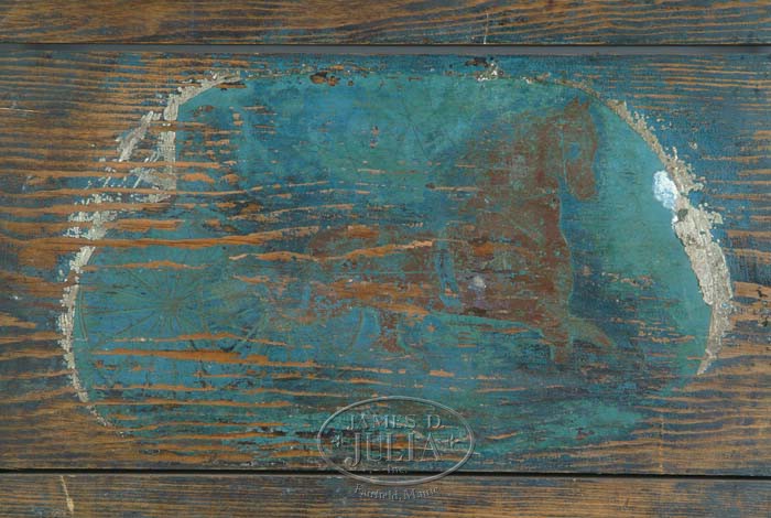 WONDERFUL EARLY 19TH CENTURY TAVERN SIGN DEPICTING GEORGE WASHINGTON ON HORSE. This outstanding early 19th Century tavern sign for the Scribner House was originally found in Massachusetts. The pine three board self framed sign depicts George Washington in his General uniform atop a great white stallion all within a landscape of trees. This is the central images in the middle of the sign with “Scribner” above and “House” below in yellow and red letters. On the top left and right of the side panel are gold stars. The reverse of the sign also with “Scribner House” depicts a vignette in the center with a very early sulky horse and a driver. The sign retains what appears to be original old rusted forged hardware on either side. SIZE: Approximately 38” sq. CONDITION: The paint on the side with George Washington is worn but still quite strong. The paint on the reverse side is much worn. Overall the sign has a great appearance. A wonderful patriotic image. 8-87083 (10,000-15,000)