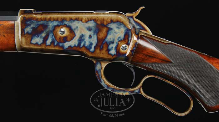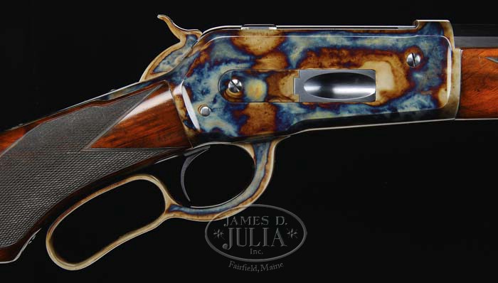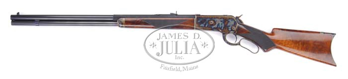 OUTSTANDING TURNBULL RESTORATION WINCHESTER 1886 DELUXE LEVER ACTION RIFLE. SN 36790. Cal. 38-56WCF. 26″ half round bbl with blade front sight with set screw and serrated side sporting rear. Mounted with XX walnut, checkered pistol grip with ebony insert, crescent butt, H-style deluxe checkered forend. Inspection of lower tang reveals assembly number 83XX and matching 83 number can be found in upper tang channel of stock and inside toe of buttplate. Accompanied with Cody Firearm Museum fact sheet identifying as 38-56 rifle, half octagon with checkered stock and pistol grip. Received in warehouse Oct. 25, 1889, shipped same day on order #4374. CONDITION: As new from restoration. Bbl and magazine tube retain all of their fine factory quality restored blue. Forend cap, receiver, lever, hammer and buttplate retain virtually all of their brilliant factory quality restored case colors. Wood has sharp, crisp checkering and virtually all of its fine factory quality restored deluxe finish. Mechanics are crisp with shiny bore and some minor scattered shallow pitting. 4-37219 BDT151 (10,000-13,000)