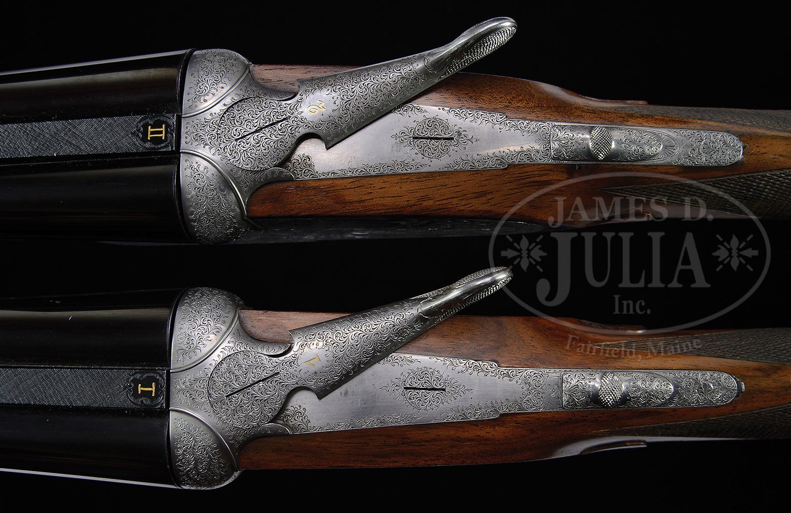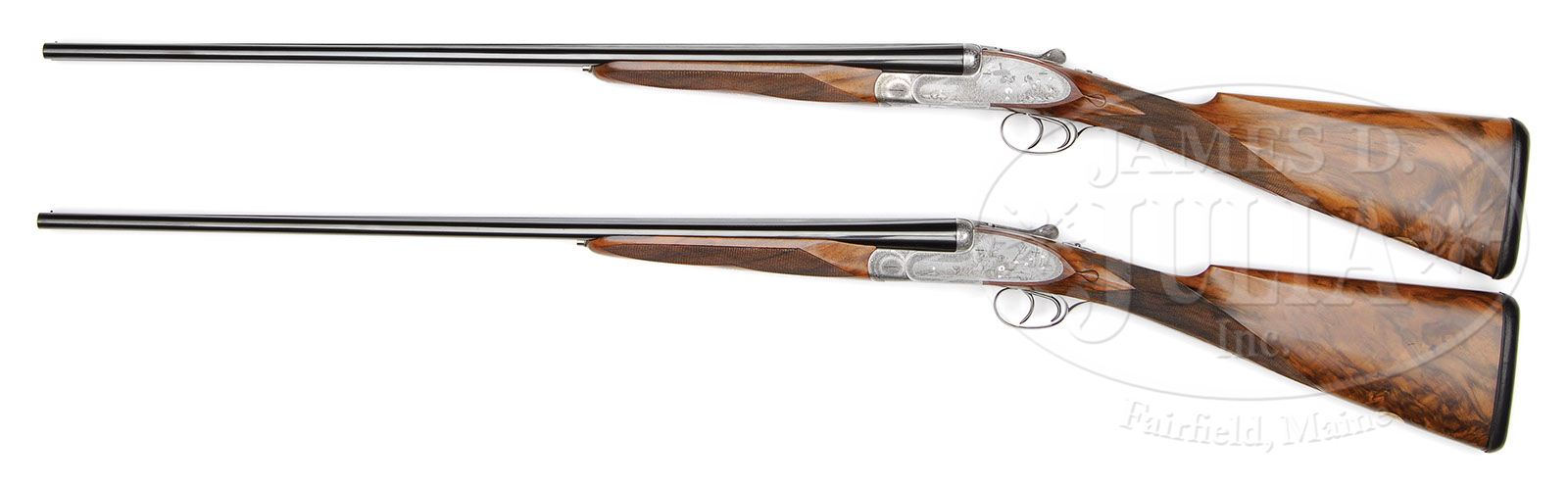 *VERY FINE CASED PAIR OF .410 GAUGE ABBIATICO & SALVINELLI SIDELOCK EJECTOR GAME GUNS WITH FINE GAME SCENES BY GALEAZZI. SN 396/ 397. Cal. .410 ga. 3″ Chambers. 26-3/4″ Beautifully struck chopper lump bbls with flat, raised, matted game ribs, are engraved “Abbiatico & Salvinelli” on left sides. Bbl flats are stamped with 1980 Italian nitro proofs. Bottoms of right bbls are engraved “Abercrombie & Fitch – Houston – Texas”. Rear lumps are stamped with first names of craftsmen involved in production of these fine guns, including Mario (Abbiatico) and Remo (Salvinelli), along with Dante, Tony, Gian, and Poli. Rear portions of ribs are gold inlaid with “I” and “II”. The numerals “1” and “2” are gold inlaid on top levers and forend tips. Coin finished, full sidelock actions feature non-automatic safeties (S inlaid), bushed strikers, and double triggers. Actions are engraved with exceptionally well cut, tiny, shaded scroll, the work of G. Marco, whose signature appears on trigger plates surrounding exceptional Bulino renditions of animals and birds. Gun no. 1 has pointer and flushing quail in meadow on left lockplate; and a pair of pointers and flushing pheasant on right. Gun no. 2 has setter and flushing pheasant in open woodlands on left lockplate; and a covey of quail being flushed by setter on right lockplate. Both guns have unusual scenes of weasel attacking a grouse portraying both animals in midair falling from branch, on bottoms of actions. This scene is pictured in MODERN FIREARM ENGRAVINGS by Mario Abbiatico (figure 245 on page 146). These finely rendered vignettes are the work of Fausto Galeazzi, whose signature appears on lower tree branch of scenes on bottoms of actions, on front portion of lockplates, except with initials “FG” on right lockplate of gun no. 2. Scroll engraved single beaded trigger guards have SNs in parchment scrolls at grips. Nicely matched, beautifully marbled, flesh-toned European walnut straight grip buttstocks measure 14-3/8″ over dark brown leather covered pads, and feature point pattern checkering with line borders, diamond hands, and classic drop points. Gold ovals on toe lines are engraved with initials “M. H. A”. Matching semi-beavertail ejector forends have Anson releases, and inlaid silver “A & S” oak wreathed shield devices on central diamonds. Gun no. 1: Bore diameter at muzzles: left-.409, right -.416. Wall thickness: left -.030, right -.033. Drop at heel: 2-1/4″, drop at comb: 1-3/8″. Weight: 5 lbs. 7 oz. LOP: 14-3/8″. Gun no. 2: Bore diameter at muzzles: left-.412, right -.417. Wall thickness: left -.037, right -.039. Drop at heel: 2-1/4″, drop at comb: 1-3/8″. Weight: 5 lbs. 8 oz. LOP: 14-3/8″. High quality leather double gun case with stitched leather corners is lined in scarlet velvet with stitched-in leather “A & S” label in lid, and is semi-French fitted for guns and accessories which include two pairs of snap caps, striker bottle, A & S marked round oil bottle, cleaning brushes and mops, and spare mainsprings and strikers in lidded compartment. CONDITION: Excellent, near new, showing little evidence of having been fired, with only a few minor marks on wood and metal, most notably a 1″ scratch on top of left bbl of gun no. 2, 6″ back from muzzle. There are a few minor handling marks on buttstocks. Mechanically crisp. Case leather is fine, with a number of minor scuffs. Straps are good. Handle replaced with a piece of belt. New keepers are screwed and riveted on. Interior cloth shows rubs and impressions from guns and accessories, with some slight staining. Accessories are excellent. A wonderful pair of guns – with today’s current model approaching $100,000.00 each. 4-47181 MGM43 (30,000-50,000)