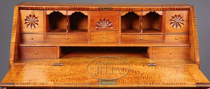 FINE RHODE ISLAND CHIPPENDALE TIGER MAPLE SLANT-LID DESK. Third quarter 18th century. The rectangular dovetailed case with hinged thumbmolded sloping lid, opening to a stepped interior fitted with four valanced pigeonholes and three square drawers pinwheel- and fan-carved, above a row of drawers stepped back over two additional drawers, the case with four graduated long drawers, all thumbmolded, raised on ogee bracket feet with shaped returns. Desk has exceptional figured woods throughout. SIZE: 44-3/4″ h. x 38″ case w. x 19″ overall d. CONDITION: Desk with fine, cleaned, and polished original surfaces. Old brass hardware in original holes. Bracket base with old professional restoration. Backboards original. 9-94461 (5,000-7,500)