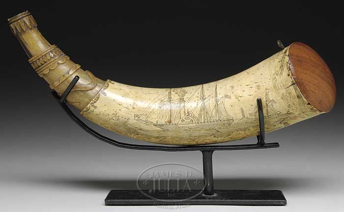 CARVED AND SCRIMSHAWED POWDER HORN. First half 19th century. With scrimshaw decoration of a two-story stone home with iron fence and with vegetation including palm trees. In foreground is a rider chasing the horse from which he has fallen. Opposite side decorated with a marine coastal scene centering a sidewheel paddle steamer; other ships and lighthouse in the background. Foreground carved with a spray centering “REMEMBER ME”. Works bordered at mouth and neck of horn by hunting serpents. Additionally bordered by tasseled drapery. No other identifying names or dates. Offered with a custom stand. SIZE: 15-1/2″ l overall. CONDITION: With mellow patina and old surfaces. Structurally very good. 7-70064 (4,000-6,000)
