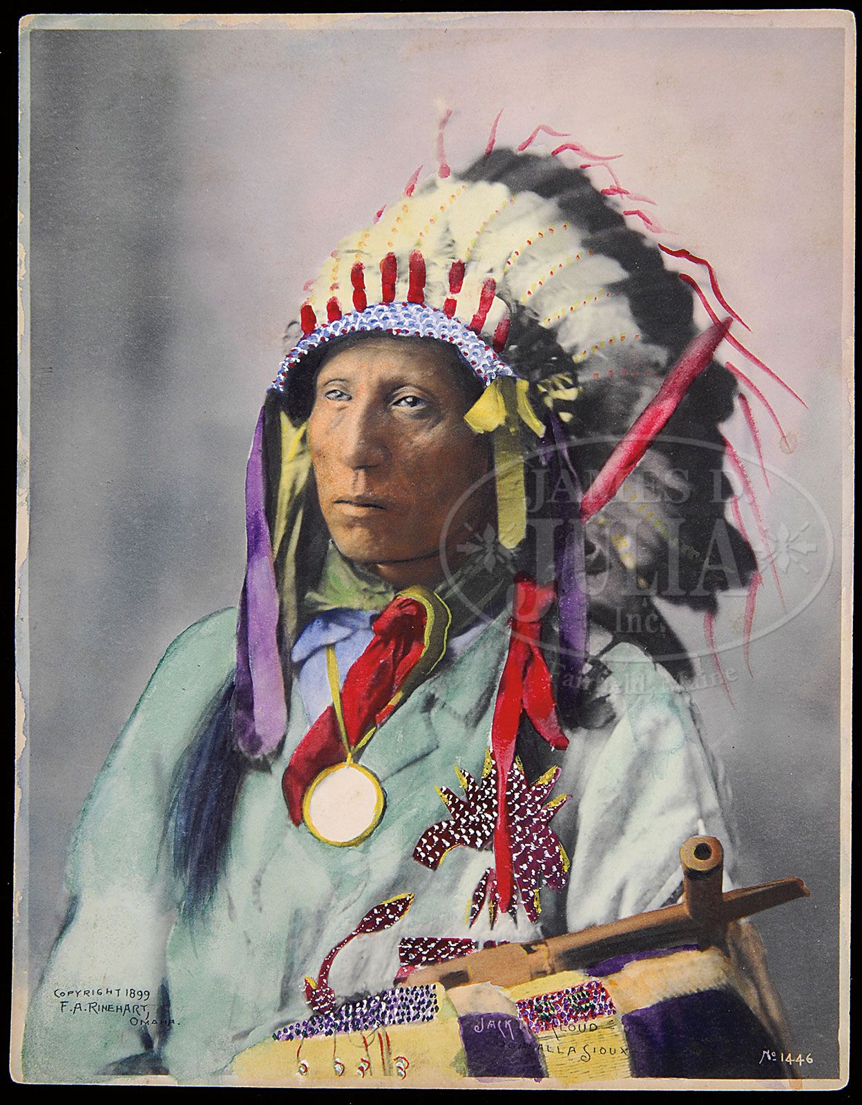 FRANK A. RINEHART: JACK CLOUD-OGALALLA SIOUX; BARE FOOT-SIOUX; LONE BEAR-SIOUX. Three uframed & unmounted hand colored platinum prints of 3 Native Americans in 1/2 view in full costume attire and each wearing feathered headdress. One wears peace medal & holds catlinite pipe, another holds pipe bag with catlinite pipe. All inscribed in the negative, inscribed “Copyright 1899 F.A. Rinehart, Omaha”. No’s 1446; 1505; 1544. All having Doll & Richards Fine Arts Boston stamps to reverse. SIZE: Image: 9″ x 7-1/4″. Overall: 9-1/4″ x 7-1/2″. CONDITION: Very good. 9-21763-29, 9-21763-32; 9-21763-39 (1,000-2,000)