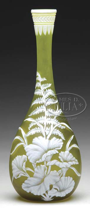WEBB CAMEO VASE. Very fine Webb vase has beautifully decorated white cameo flowers, stems and leaves against a citrine background. Lip of the vase is decorated with a stylized leaf design beneath a chevron panel leading to a double white band. Back of the vase is undecorated. Unsigned. SIZE: 10-1/4″ t. CONDITION: Very good to excellent. 5-60449 (1,750-2,250)