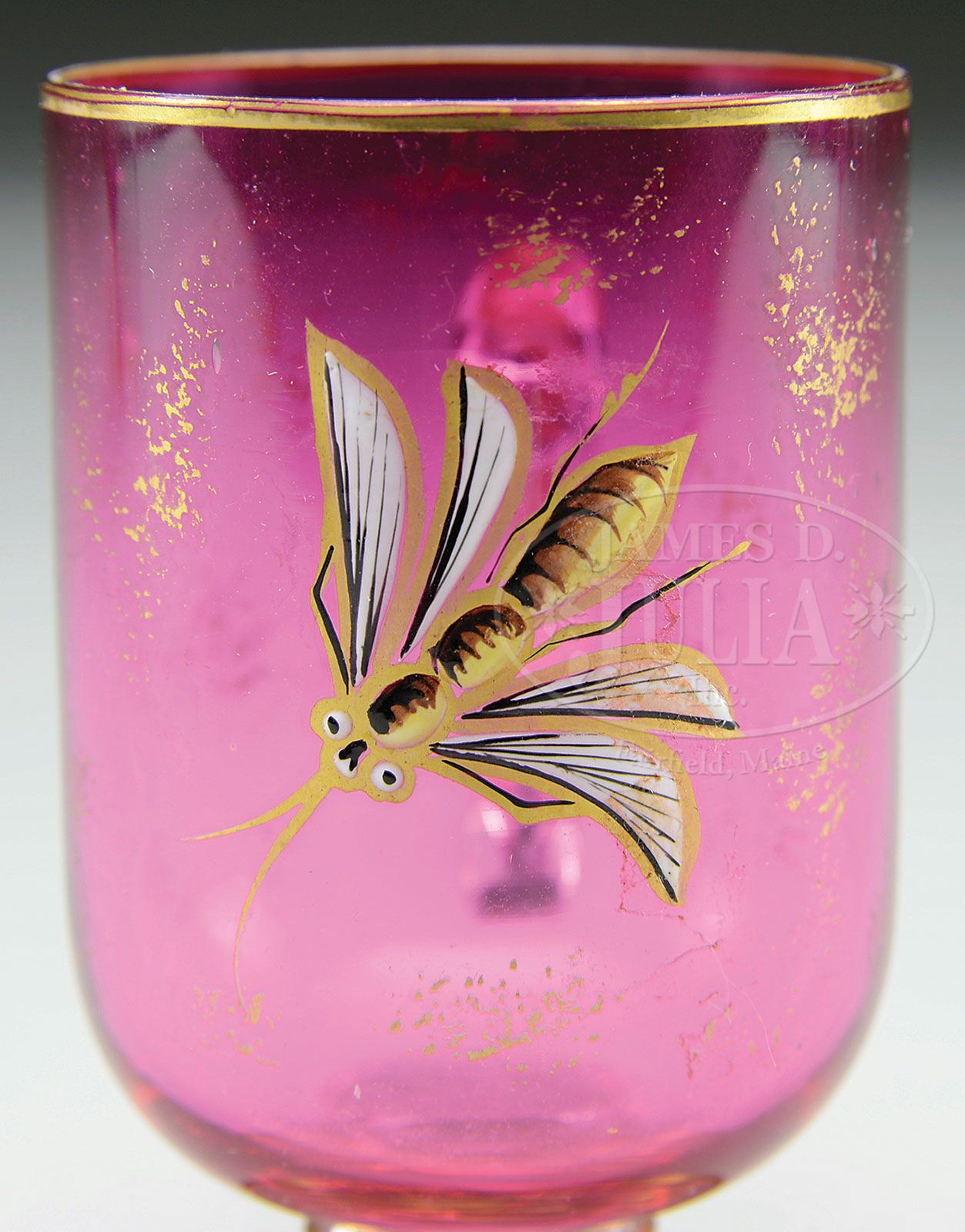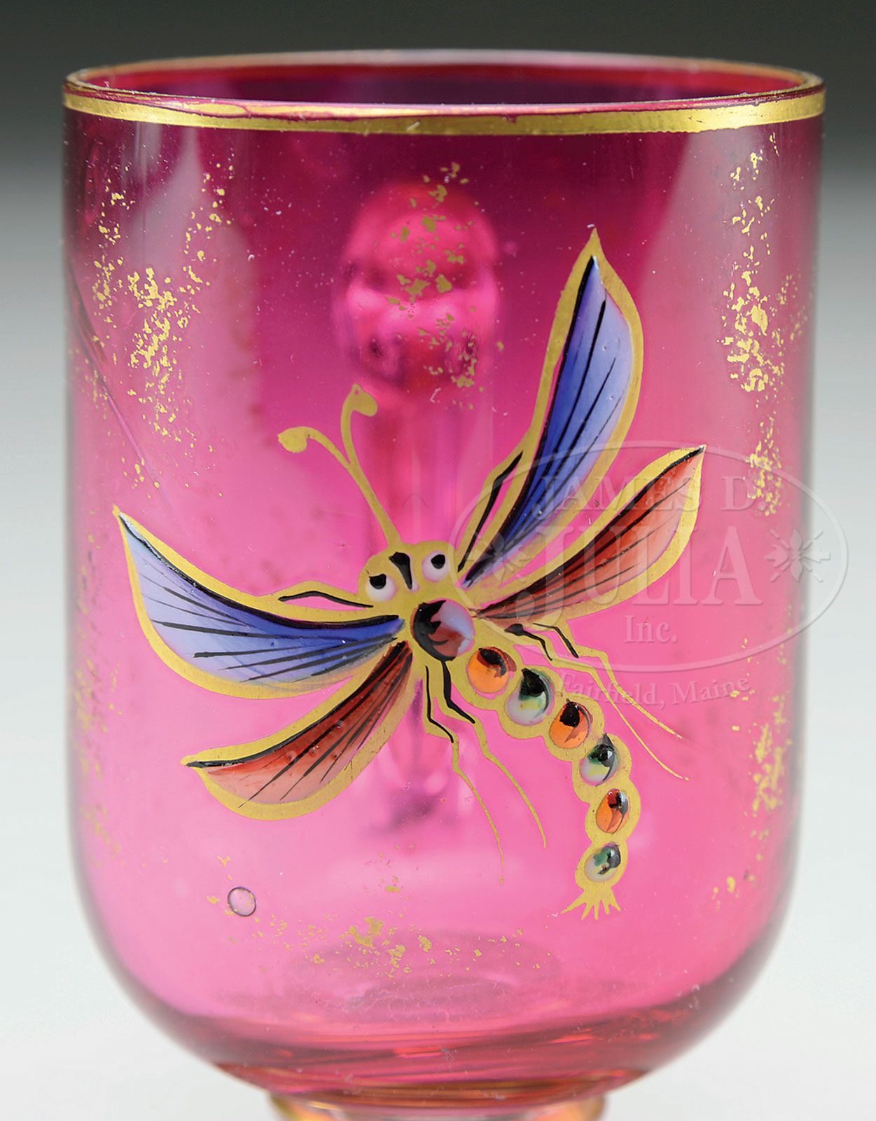 DECORATED MOSER 8 PIECE APERITIF SET. This aperitif set includes a tray, decanter with stopper and 6 cups. This wonderful set is decorated with dragonflies, grasshoppers and wasps all on a cranberry ground. The decanter and cups have clear applied glass handles. The decanter is finished with a clear glass stopper. SIZE: Tray: 11 x 13″, decanter: 10-1/2″ t, cups: 3″ t. PROVENANCE: From a private west Texas collection. CONDITION: Very good to excellent with minor wear to gold and some roughness to inside bottom edge of foot. 5-65949 (800-1,200)