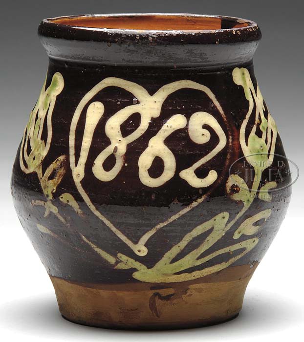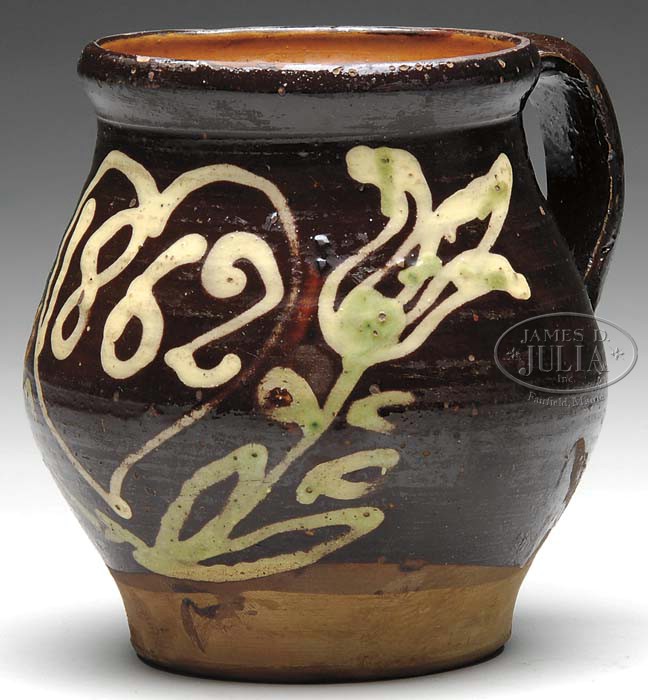 IMPORTANT TULIP DECORATED REDWARE MUG. Circa 1862, probably Pennsylvania. Small bulbous mug slip decorated in yellow and green with flowering tulips centering a heart further centering the date “1862” in yellow slip. Reference: Tulipware of the Pennsylvania-German Potters by Edwin Atlee Barber, see page 55 for similar examples. SIZE: 5-1/4″ h. CONDITION: Very good overall with normal and expected bubbles in glaze. Minor wear to glaze on rim. 9-24479 (900-1,100)
