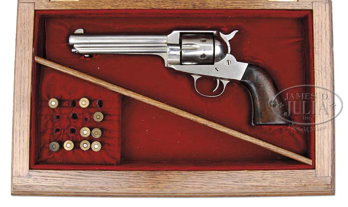 EXTREMELY RARE REMINGTON MODEL 1888 NEW MODEL POCKET ARMY SINGLE ACTION REVOLVER. SN 460. Cal. 44 WCF (44-40). Nickel finish with 5-3/4″ bbl, re-attached or replaced German silver front sight and 1-line right hand “E. REMINGTON & SONS, ILION. N.Y. U.S.A.” address. It has the usual 6-shot fluted cyl with loading gate in right recoil shield. The ejector housing is scalloped like the successor Model 1890. For many years this model remained unidentified until an obscure 1889 Hartley & Graham catalog was discovered which advertised these revolvers. It is speculated that fewer than 1,000 of these revolvers were produced in the period 1888-1889 as a transition between the Model 1875 and the Model 1890. They apparently were manufactured using modified left over Model 1875 parts when Hartley & Graham purchased Remington and were marketed, according to the referenced catalog, as the “New Model Pocket Army”. The catalog advertises a 5-1/2″ bbl, but according to Flayderman’s Guide to Antique American Firearms many are found with a 5-3/4″ bbl as found here. Referenced publication also states that most are found with a lanyard loop in the buttstrap and marked with the caliber, neither of which are present on this revolver. Mounted with 2-pc smooth walnut grips that, although no numbers are visible, appear to fit very well and are probably orig to this revolver. An assembly number “37” is found on front of frame, bottom of bbl and top of ejector housing. Accompanied by a fine, red velvet, lined custom oak casing recessed in the bottom for the revolver with a diagonal divider and a cartridge block with holes for 16 cartridges and which contains 9-rds. PROVENANCE: Wes Adams Estate Collection. CONDITION: Very good. Overall retains most of an old re-nickeled finish showing heavy muzzle edge wear with some fine pitting on the frame; hammer spring is a modern replacement; grips have chipped toes and show very heavy wear and retain an old refinish. Hammer is not solid in safety notch, otherwise mechanics are fine, strong bore with scattered fine pitting. Case is extremely fine. 4-44868 JR394 (3,500-6,500)