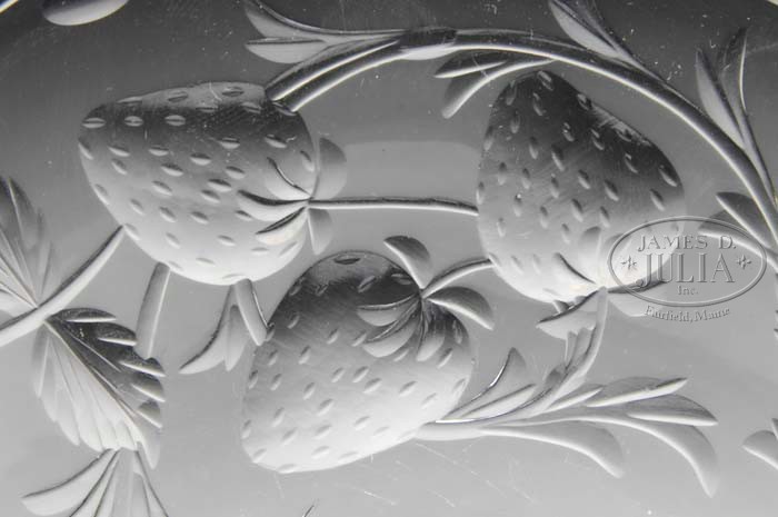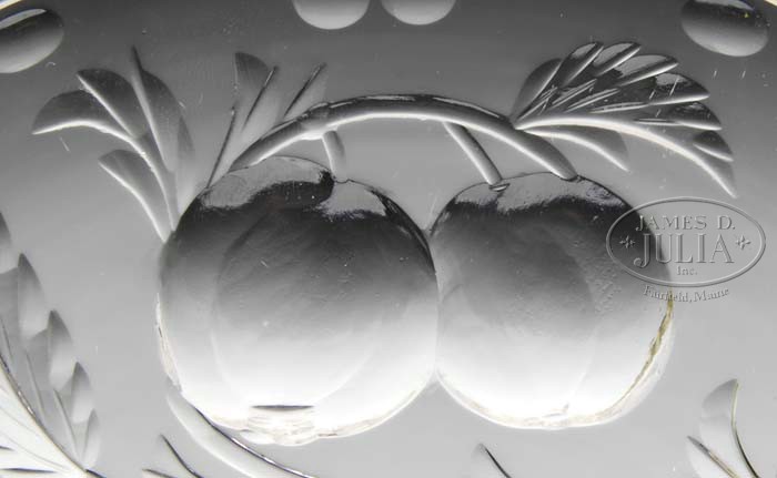 Additional Information: One plate has a chip to the edge. TWELVE CUT GLASS FRUIT PATTERN PLATES. Wonderful set of twelve cut glass plates are decorated with patterns of carved various fruits. There are two plates each including raspberries, grapes, peaches, pears, cherries and strawberries. Unsigned. SIZE: Each are 8-1/2″ dia. PROVENANCE: From the Collection of Dorothy-Lee Jones. CONDITION: Very good to excellent with some minor scratches to bottom of plates. 5-63199 (200-400)