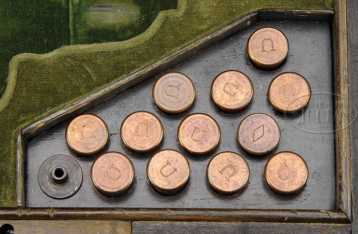 CASED IVORY WILLIAMSON SINGLE SHOT DERINGER. SN 3764. Cal. 41. Rarely seen are ivory stocked Deringers and they are always controversial however, the ivories on this gun have good “mellow” patina that appear orig. The casing of this single pistol retains woodblock with 12 orig cartridges and an auxiliary chamber made of blued steel for use with percussion cap. Gun conforms in configuration to other examples with 2-1/2″ bbl which slides forward for loading, brass frame and trigger guard and “WILLIAMSON’S PAT. OCT. 2 1866 NEW YORK” on left side of bbl with the distinctive decorative arrow motif engraved on top of bbl. Brass frame and trigger guard are engraved and are gold plated which is a scarce feature on these guns along with silver plated bbl. This is an interesting cased gun that presents nicely. CONDITION: Bbl and frame have matching serial numbers. Bbl markings are crisp and easily discerned. Bbl retains about 80% of its orig silver plating with freckling and pitting. Brass frame and trigger guard retain about 30-40% of their orig gold plating especially in protected areas. The trigger guard screw which also acts as stop for bbl is probably replaced as it does not have the typical engraving found normally on head. Ivory stock are sound and solid with good discernible checkering; several hairline cracks typical of old ivory, one crack on left side of stock has about 1/2″ by 1/32″ chip as can be seen in photos. Stocks fit fairly well but there are gaps and protrusions above plane of ivory as can be seen in photos. The 8-1/4″ x 4-3/4″ x 1-3/16″ accompanying casing is fitted with green velvet and is French form fitted which is in overall very good condition. Keyhole is missing its escutcheon. 4-46283 JS160 (7,500-12,500)