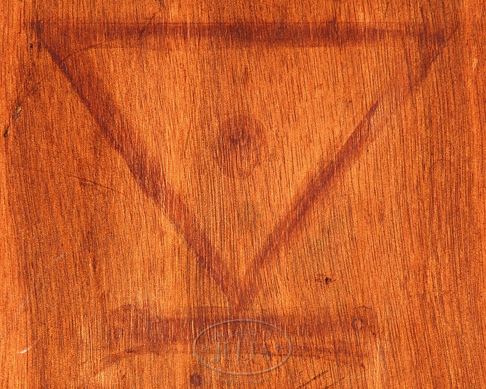 MORGAN RUSSELL (American, 1886-1953) SYNCHROMIST ABSTRACT. Oil on wood panel abstract with triangular and geometric shapes in colors of yellow, gold, green, blue, red, and brown. Signed lower left “M Russell”. Back having a painted symbol of a triangle with center dot over a horizontal line with two vertical lines. Housed in a flat wood frame with black liner. SIZE: 23″ x 19-1/4″. CONDITION: Very good, two letters in signature enhanced and a small minor inpainted chip. 9-96838 (10,000-15,000)