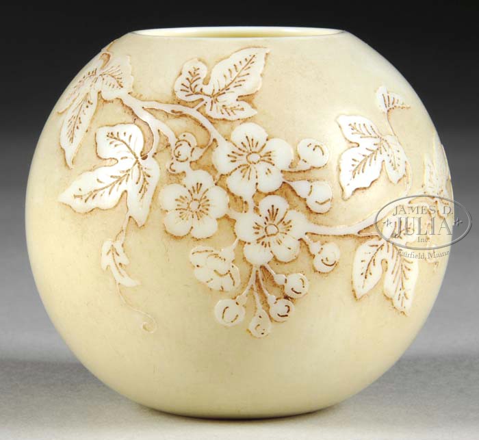 WEBB CAMEO ROSE BOWL. Petite ivory cameo rose bowl is decorated with dogwoods and foliage to one side with reverse having a butterfly in flight. Signed “Thos Webb & Sons”. SIZE: 2-1/2″ t. CONDITION: Very good to excellent. 5-61912 (700-1,000)