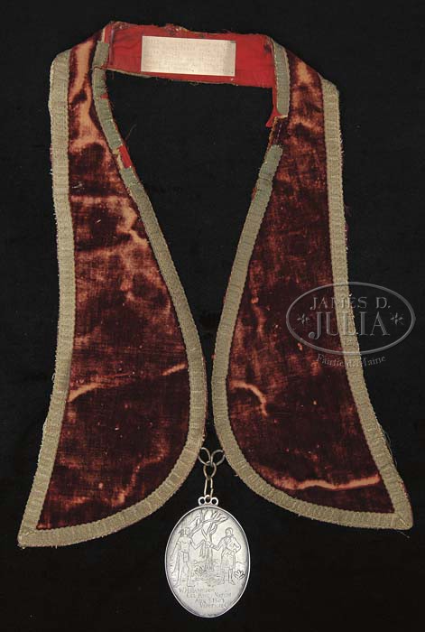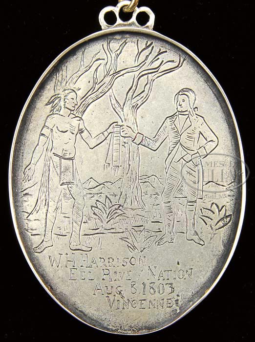 CAST SILVER OVAL INDIAN PEACE MEDAL. SN NSN. 3-3/4″ x 2-3/4″ cast silver medal has scene depicting transfer of wampum peace belt between American native and colonial gentleman, marked “W. H. Harrison” “Eel Rivey Nation” “Aug 8, 1803” “Vincennes”. Reverse: depicts heraldic American eagle with initials “WK” stamped at top. Medal is suspended by plated steel link chain sewn to old red velvet collar, with gilt tracings on edges. Typewritten old notation at top of collar displayed in oak hinged case with glass front on green felt backing. PROVENANCE: Wes Adams Estate Collection. CONDITION: Fine. Medal has slight tarnish. Old collar with cloth rubbed through. Gilt tracings are parting, with bits missing. Case is fine. 4-44888 MGM361 (250-450)