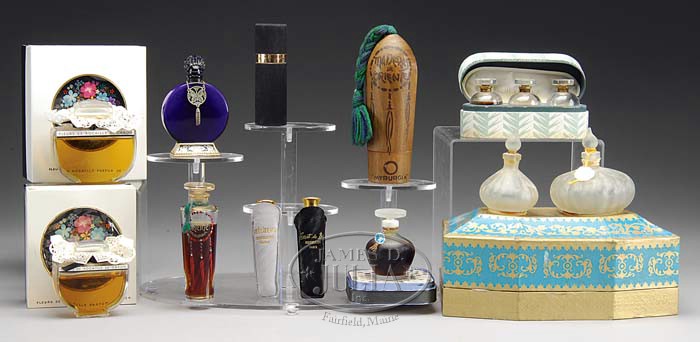 LOT OF 11 PERFUME BOTTLES. Lucretia Vanderbilt, empty bottle, Clear bottle marked in Cyrillic, full bottle with box base only, “Carnet de Bal” by Revillon, ¼ oz box, “Maderas de Oriente” by Myrugia with paper labels, 3/4 full bottle, “Maderas de Oriente” by Myrugia, full bottle with wood container, “Detcheme” by Revillon, 1/4 oz, full bottle with pouch, “Carnet de Bal” by Revillon, 1/4 oz, full bottle with pouch, “Carnet de Bal”, “Detchema” and “4Vents” by Revillon, net 1 oz, all half full in box, “Fleurs de Rocaille” by Caron, marked “183”, full bottle in box, “Fleur de Rocaille” by Caron, marked “17”, full bottle, 2 clear bottles in Cyrillic marked box, empty bottles. SIZE: 2-1/2″ to 4-3/4″ t. PROVENANCE: From the Estate of Geraldine Gaba, Scottsdale, AZ. CONDITION: Lucretia is cracked, one Fleur de Rocaille box in poor condition, otherwise lot is good. 5-68286-8 (500-700)