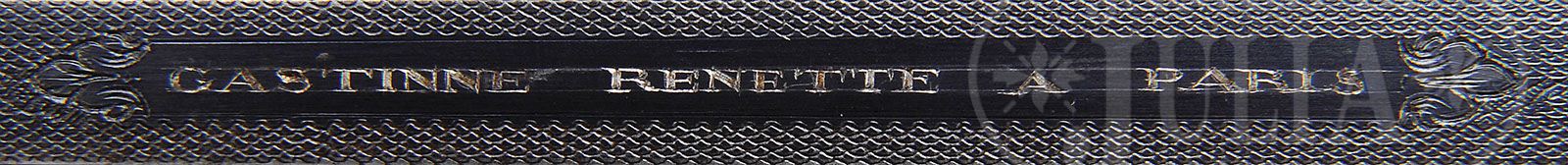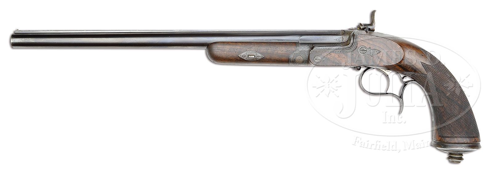 EXCEPTIONALLY FINE, GASTINNE RENETTE SIDELEVER TARGET/SHOT PISTOL WITH CASE. SN 12. Cal. .32 ga. 2-1/2″ Chamber. Smooth bore. Considerable choke. A best quality single shot pistol has 14″ fluid steel bbl with flat, tapered, matted, full length integral rib engraved “GASTINNE RENETTE A PARIS” in unmatted portion. Breech area has scroll engraved, beautifully filed, bolsters. There are no proof marks anywhere on this pistol (pre 1897). Bottom of bbl is stamped “GR” and with SN. Beautifully filed, case hardened, miniature, bar-in-wood side lever action is fitted with U-notch rear sight. Bar action lock has rebated tail of plate and nicely filed serpentine hammer. Action and lock are engraved with nicely cut, simple, small scroll with rose bouquet highlights, reminiscent of England’s “best” style. Side lever and spurred trigger guard are charcoal blued and scroll engraved. Finely figured European walnut stock extends to long bell-shaped grip with heavy case hardened steel cap. Point pattern checkering with double line borders wraps around grip. Short, uncheckered forend attaches to bbl with captive side nail through engraved steel lozenge shaped escutcheons. This unusual pistol comes in its original tan leather case with double latch closure with carrying straps. Top of case is embossed with initials “W.E.C.” Interior is lined in light tan kidskin and has lidded compartment containing cleaning jag and Turk’s head. A long compartment contains ebony headed swiveling cleaning rod. In “The Art of Wingshooting”,Leffingwell, 1895, the author states that Annie Oakley owned two single-barreled pistols made by this celebrated maker. These pistols had 14-inch barrels, and were made expressly for pigeon shooting. With them Miss Oakley scored nine out of ten pigeons from two traps, using one-half ounce of shot. Guns of this type were also used in simulated dueling competitions using wax projectiles at the Gastinne-Renette Gallery in Paris. Noted shooting expert Chevalier Ira Paine was awarded the Grand Medal d’Or on many occasions at these annual events. CONDITION: Exceptionally fine, near new, as found. Bbl retains nearly all its orig bright blue, silvered slightly at muzzle, with a few minor marks, mostly on bottom. Action and lock retain nearly all their orig case hardening color. Side lever and trigger guard have slight silvering of their orig blue. Stocks retain nearly all their orig oil finish, which is quite dry. There is a 3/4″ shrinkage crack running from top of trigger plate toward front of action. Gun has obviously been in storage for a very long time with congealed oil on bright polish of lumps, and clouding brightness of case hardening. Bore is excellent, bright and shiny. Action is tight, bbl is on face. Lock is crisp. Case leather has darkened slightly, and has a few minor rubs. Carrying straps and handle are fine. Interior leather has some soiling and rubs through from contact with gun. Lid of interior compartment has detached, and needs attention. Cleaning accessories are excellent. A superb investment quality, unusual creation, of this highly regarded French maker. 4-46077 MGM11 (3,000-5,000)