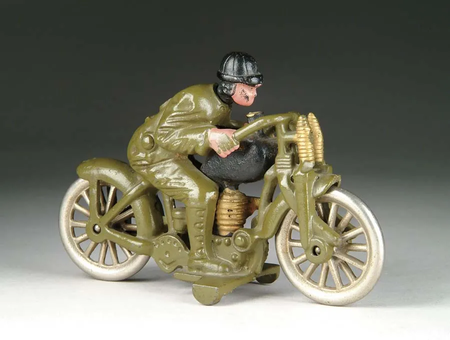 HUBLEY HILL CLIMBER MOTORCYCLE. Brightly enameled olive green cycle carrying rider with pivoting head, black helmet, flesh tone face and hands, #2 on back, separately cast cylinder and gas tank in black and gold, and nickel-plated wheels. Hubley owned the exclusive rights to the Hill Climber motorcycle. SIZE: 6 3/4”. CONDITION: Cycle is virtually mint, only noticeable wear on rider’s face and hands. MC 1-4312 (800-1,000) Auction: Advertising, Toy & Doll - Spring 2005 Please Note: All prices include the hammer price plus the buyer’s premium, which is paid by the buyer as part of the purchase price. The prices noted here after the auction are considered unofficial and do not become official until after the 46th day. |